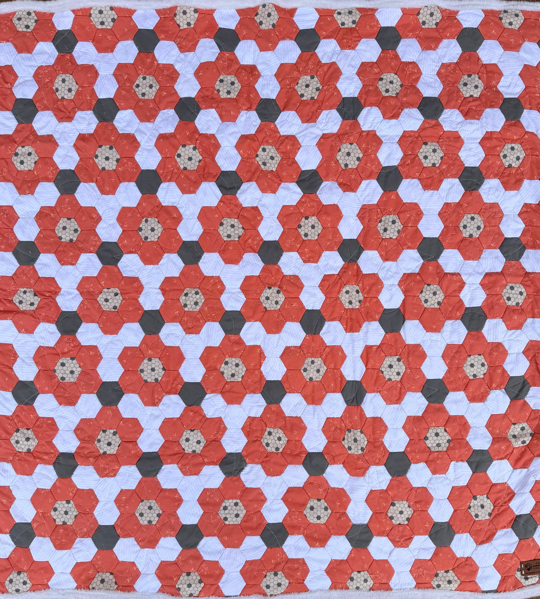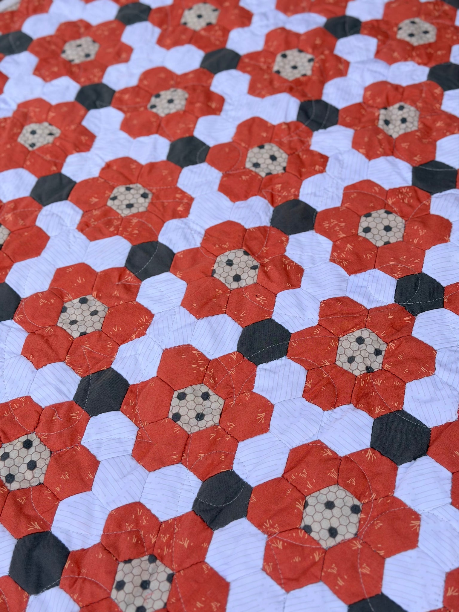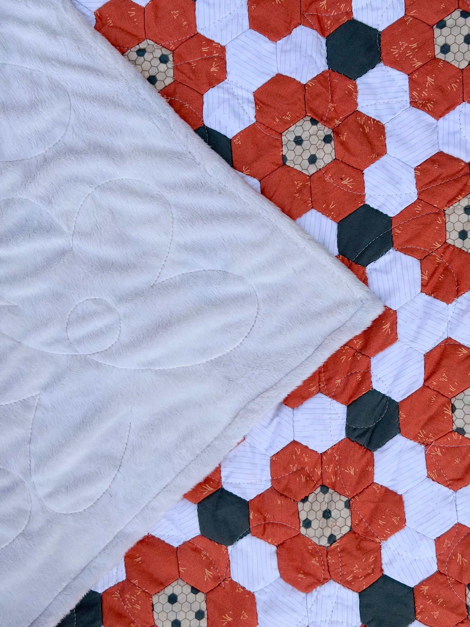 Beautifully hand-stitched hexagon quilt. Majority of fabric is donated and proceeds employ women living in poverty in the "bordos" of San Pedro Sula, Honduras