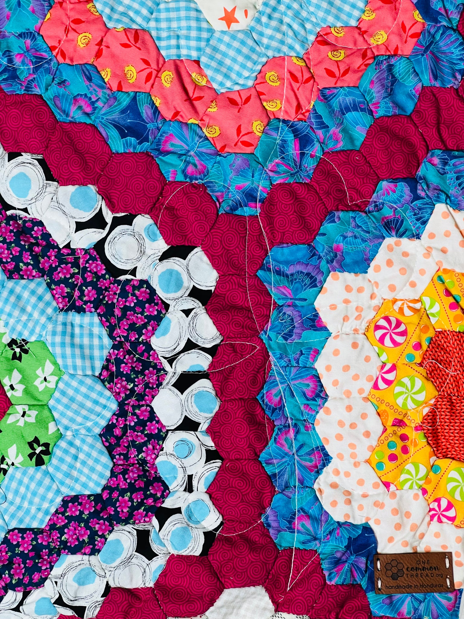 Beautifully hand-stitched hexagon quilt. Majority of fabric is donated and proceeds employ women living in poverty in the "bordos" of San Pedro Sula, Honduras