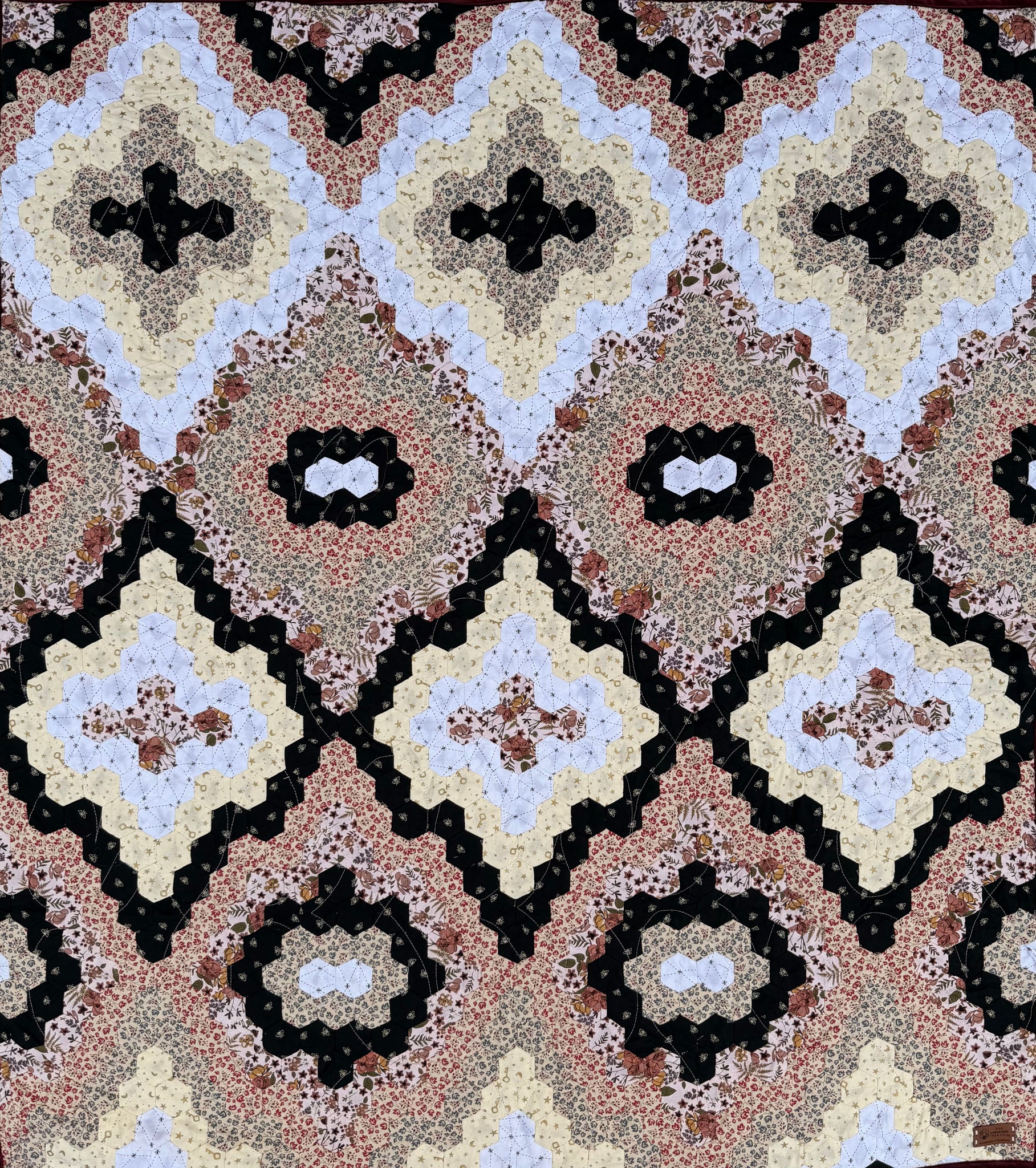 These elegant fabrics are such a gorgeous combination that Mariana used to make this quilt.   This quilt is lovingly called Bee Tree Cove due to the bumble bee fabrics.  Mariana is a mother of one of our Makers that started off just by helping her daughter but has enjoyed having the extra money to help her large family of 11!  Mariana is the mother of 9 with lots of grown children but still has 5 at home and also takes care of her 73 year-old mother.