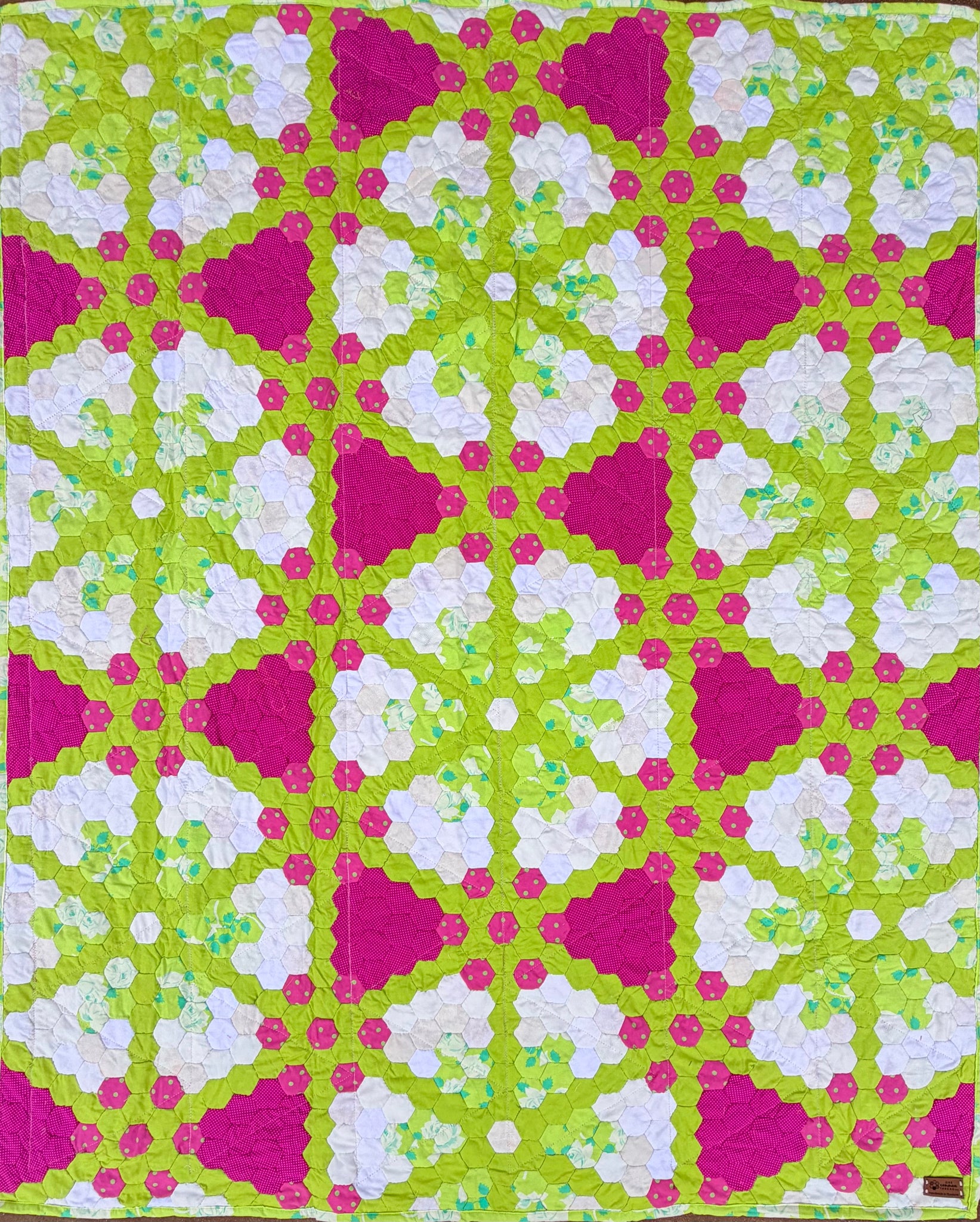 Beautifully hand-stitched hexagon quilt. Majority of fabric is donated and proceeds employ women living in poverty in the "bordos" of San Pedro Sula, Honduras
