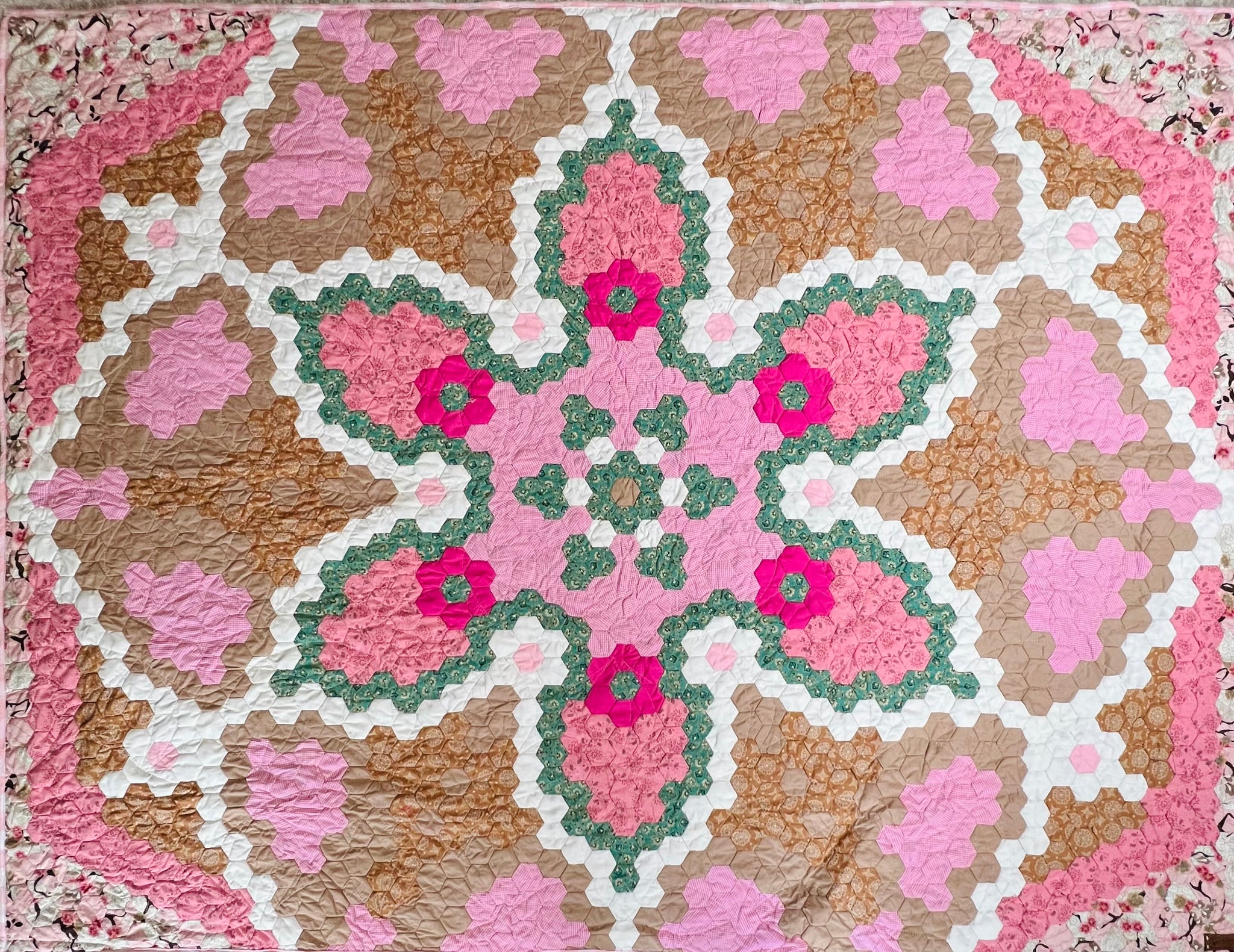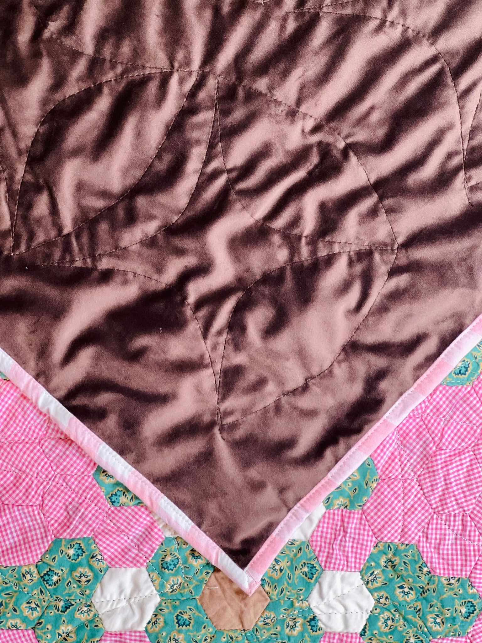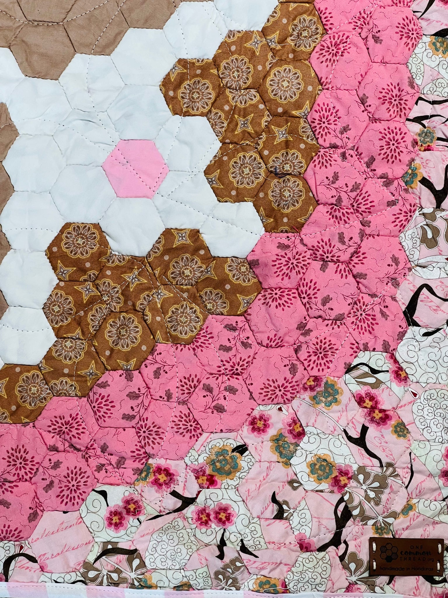 Beautifully hand-stitched hexagon quilt. Majority of fabric is donated and proceeds employ women living in poverty in the "bordos" of San Pedro Sula, Honduras