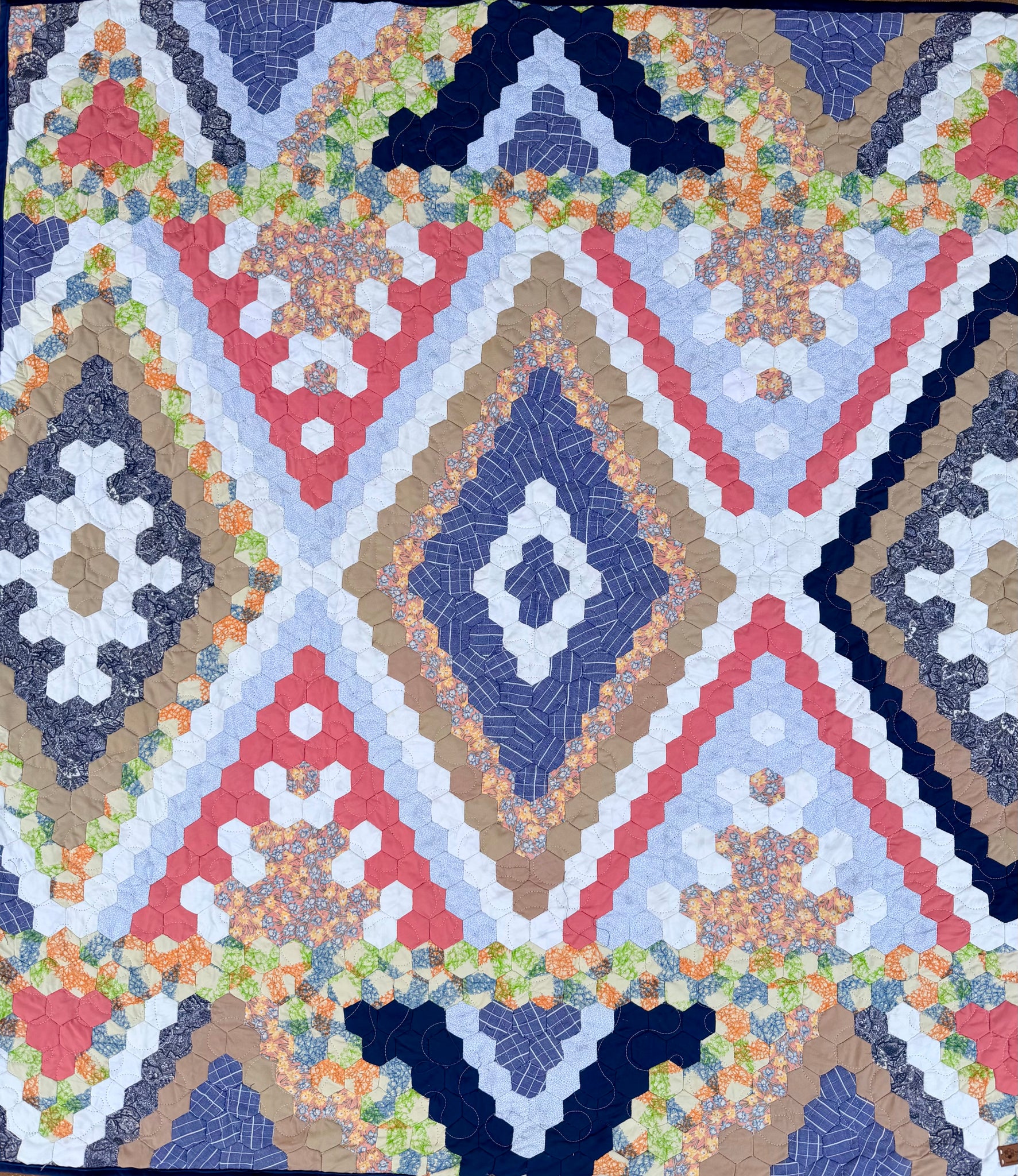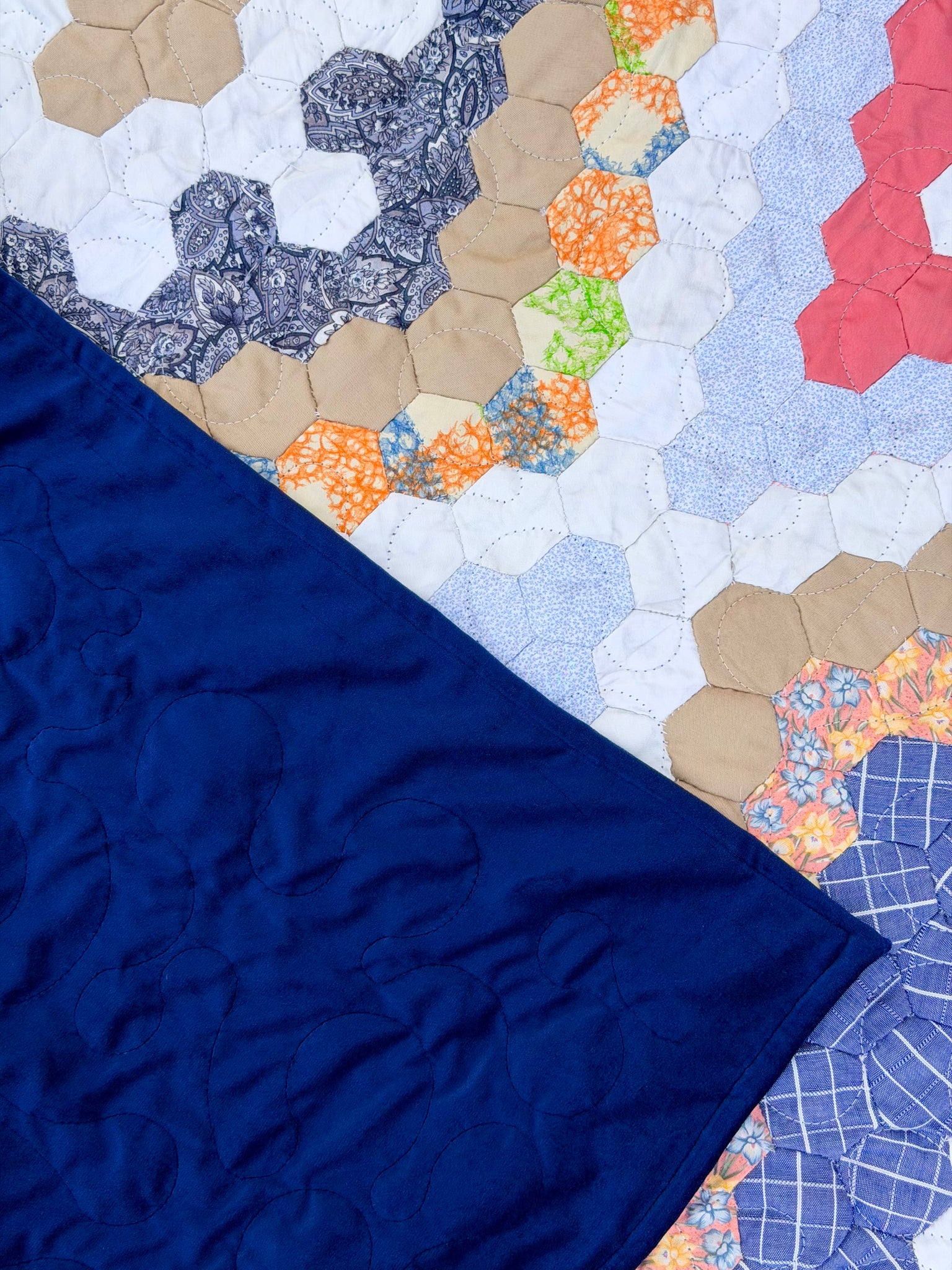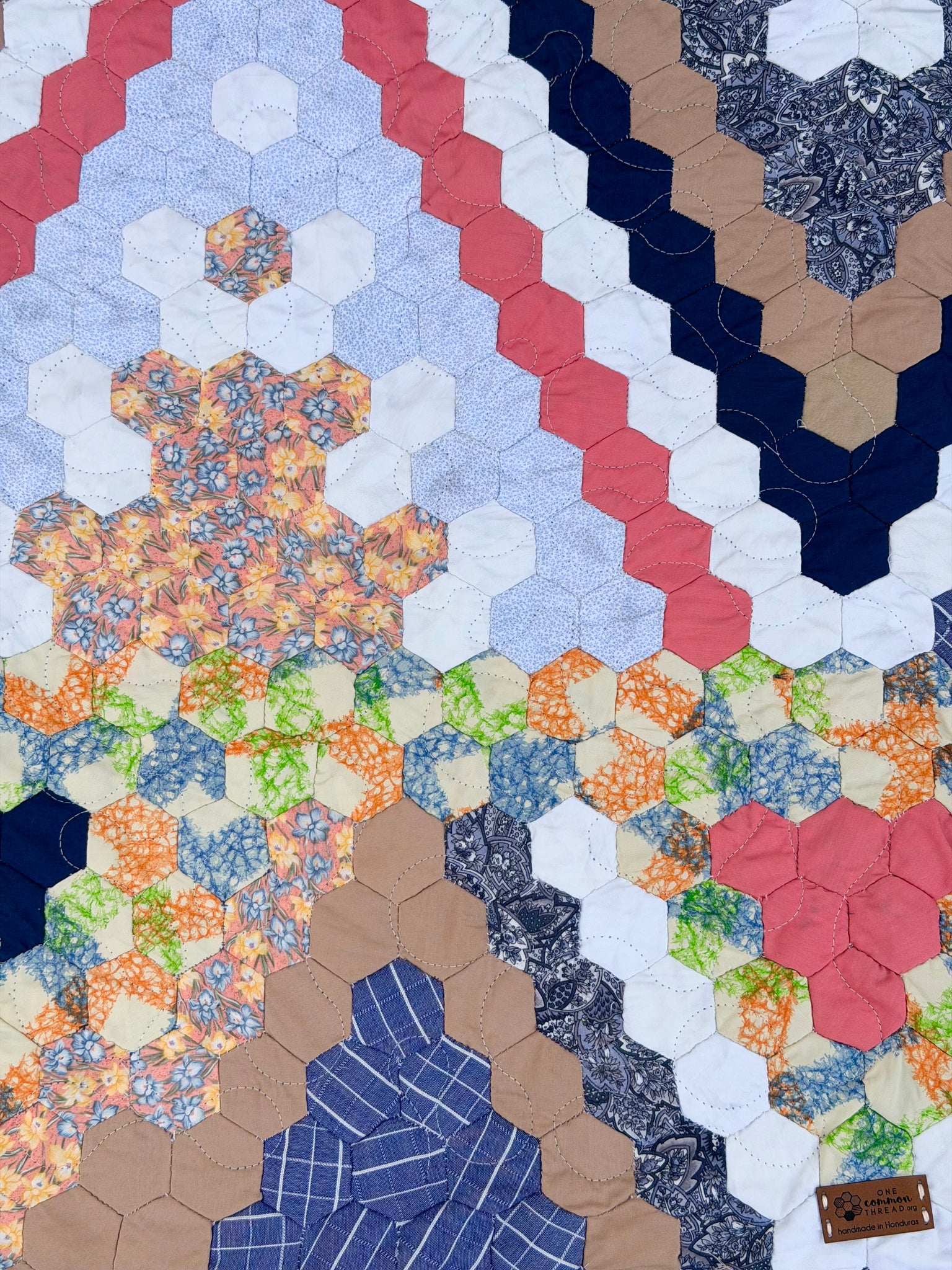 Beautifully hand-stitched hexagon quilt. Majority of fabric is donated and proceeds employ women living in poverty in the "bordos" of San Pedro Sula, Honduras