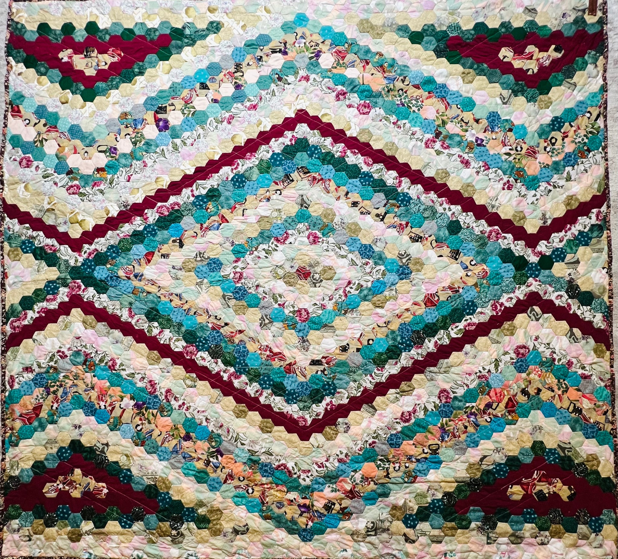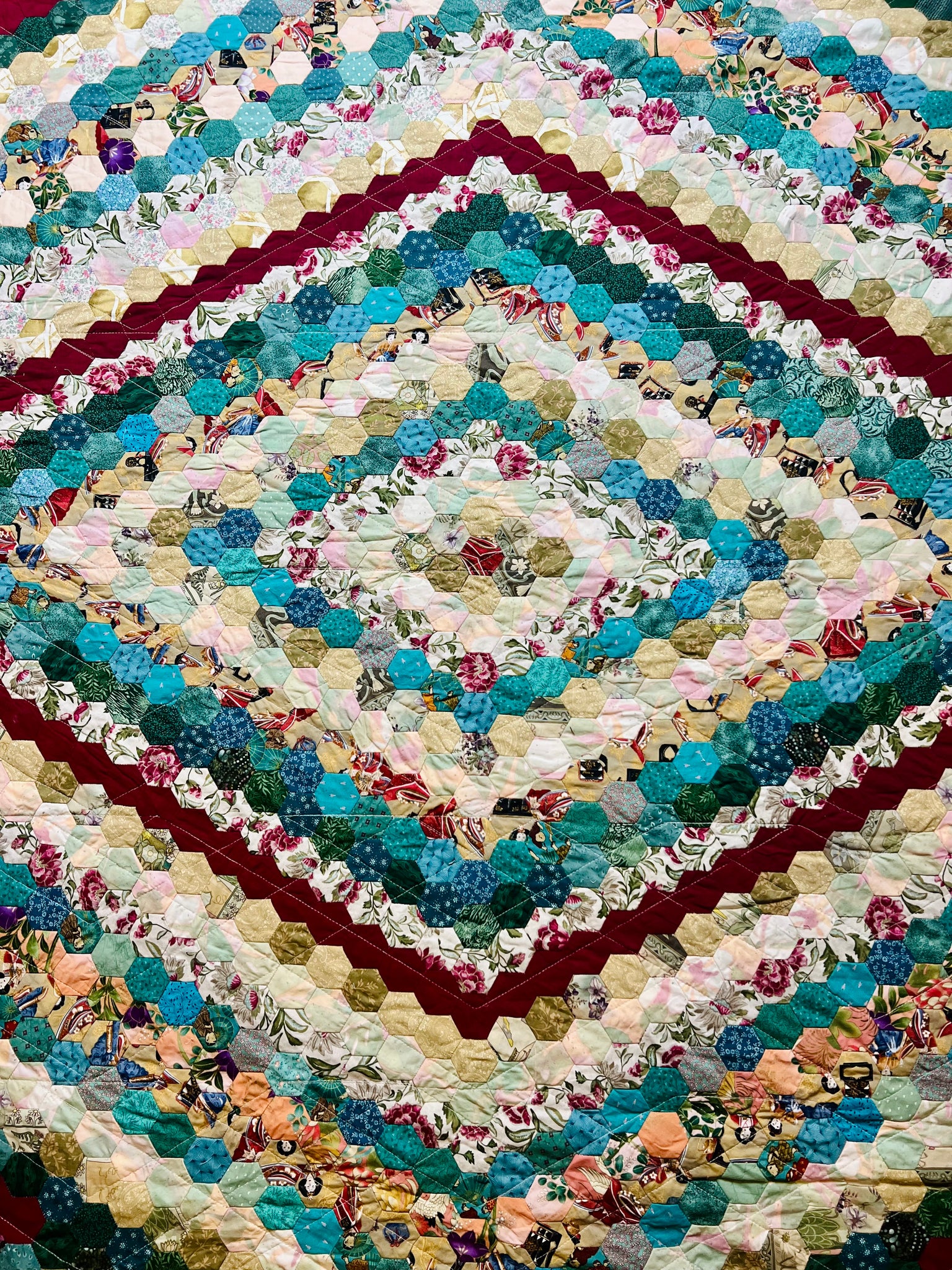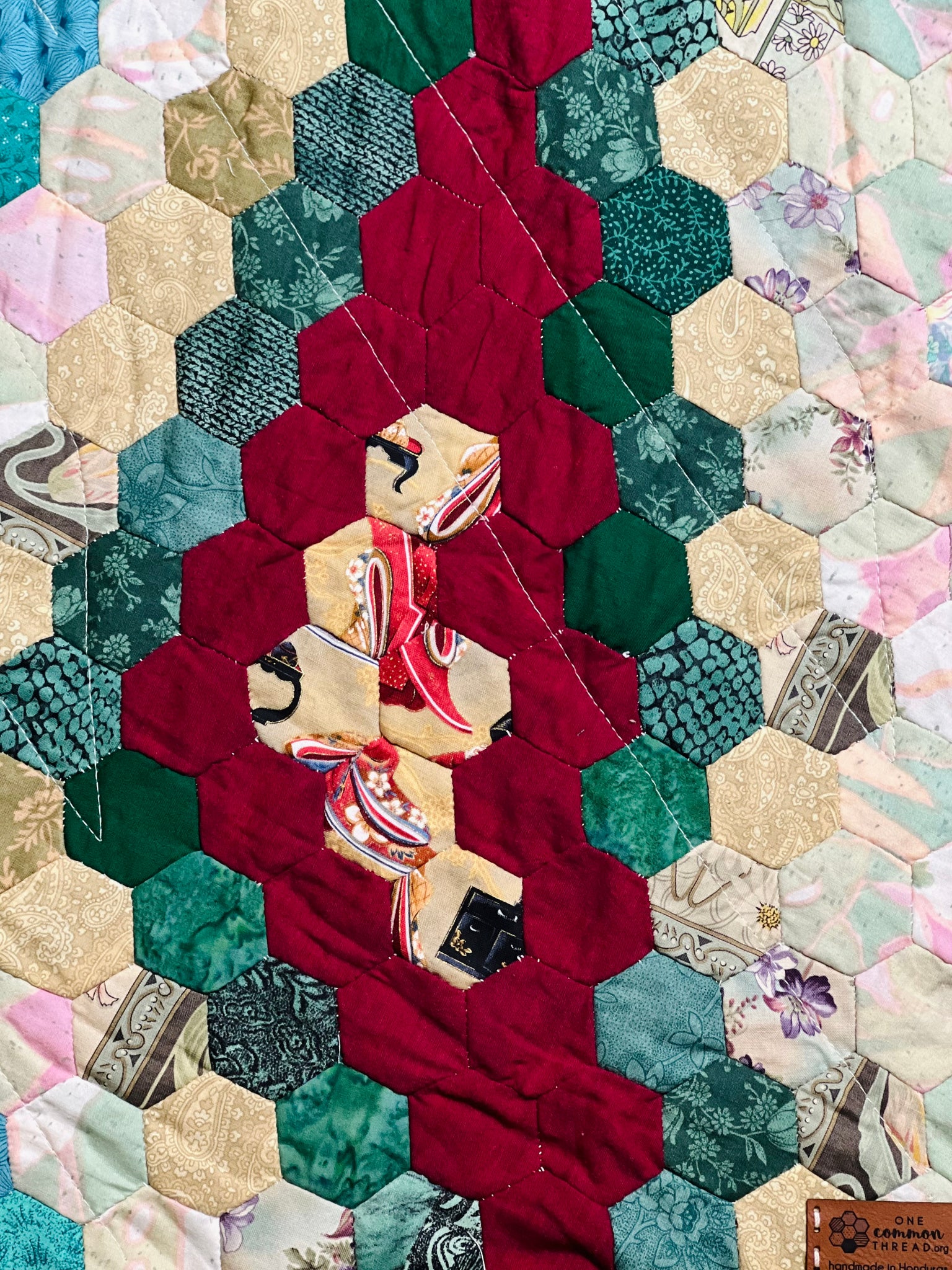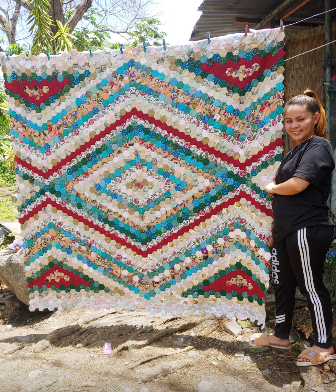 Beautifully hand-stitched hexagon quilt. Majority of fabric is donated and proceeds employ women living in poverty in the "bordos" of San Pedro Sula, Honduras