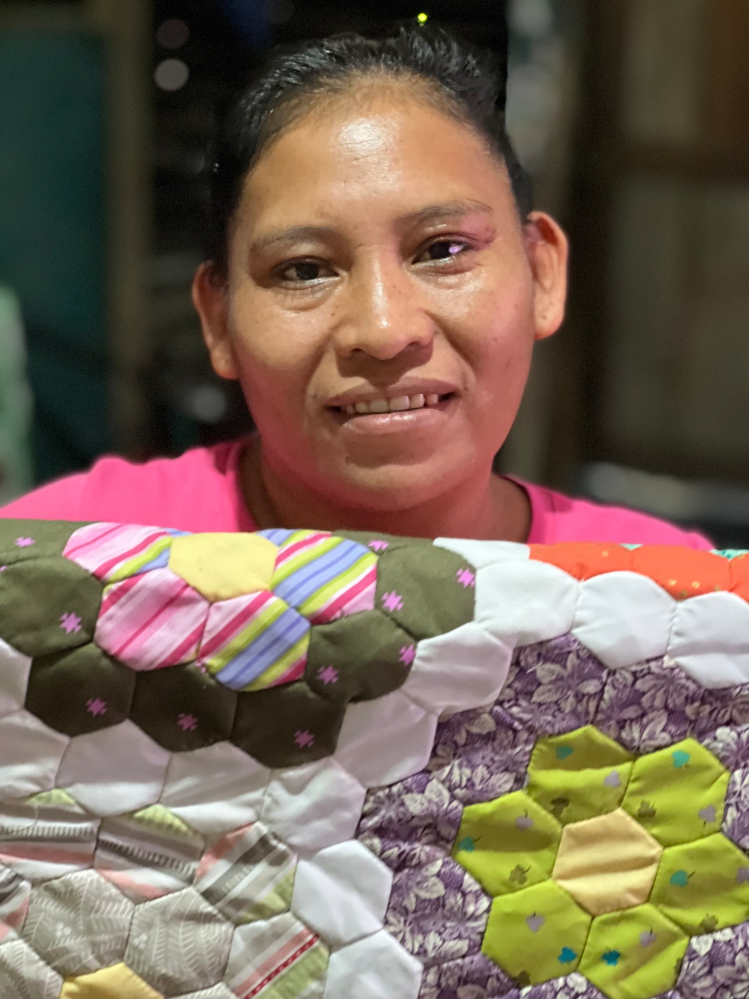 This beautiful quilt, is called Lead Me Guide Me Walk Beside Me, was made by our talented maker, Marta. Marta’s story is a testament to the positive influence of other women in the bordo. She learned to sew from her neighbor and has since embraced the skill, enjoying the ability to earn a living independently.