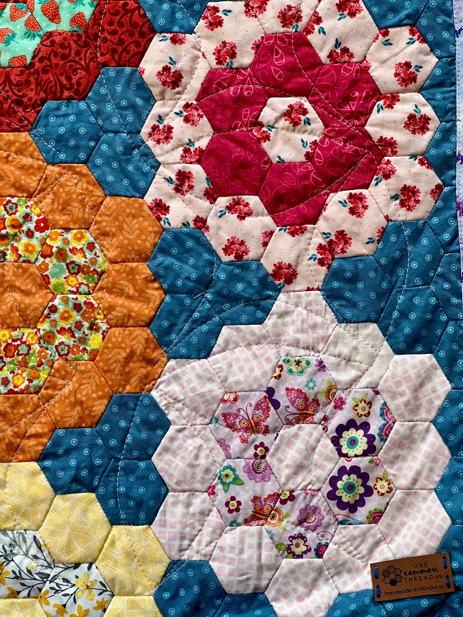 Beautifully hand-stitched hexagon quilt. Majority of fabric is donated and proceeds employ women living in poverty in the "bordos" of San Pedro Sula, Honduras