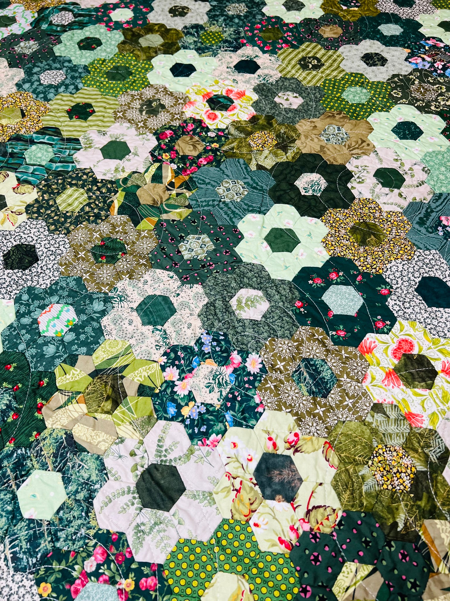 Beautifully hand-stitched hexagon quilt. Majority of fabric is donated and proceeds employ women living in poverty in the "bordos" of San Pedro Sula, Honduras