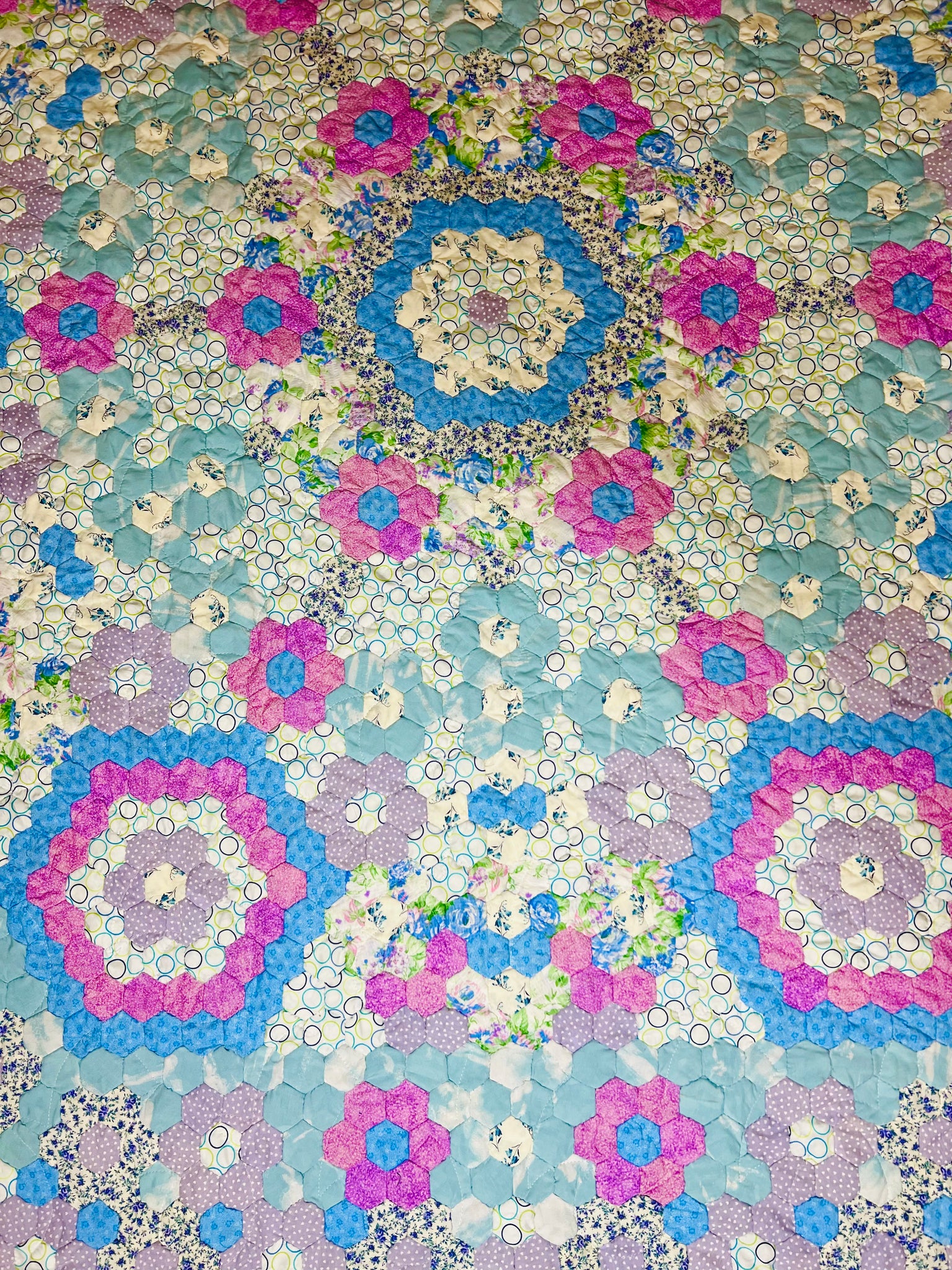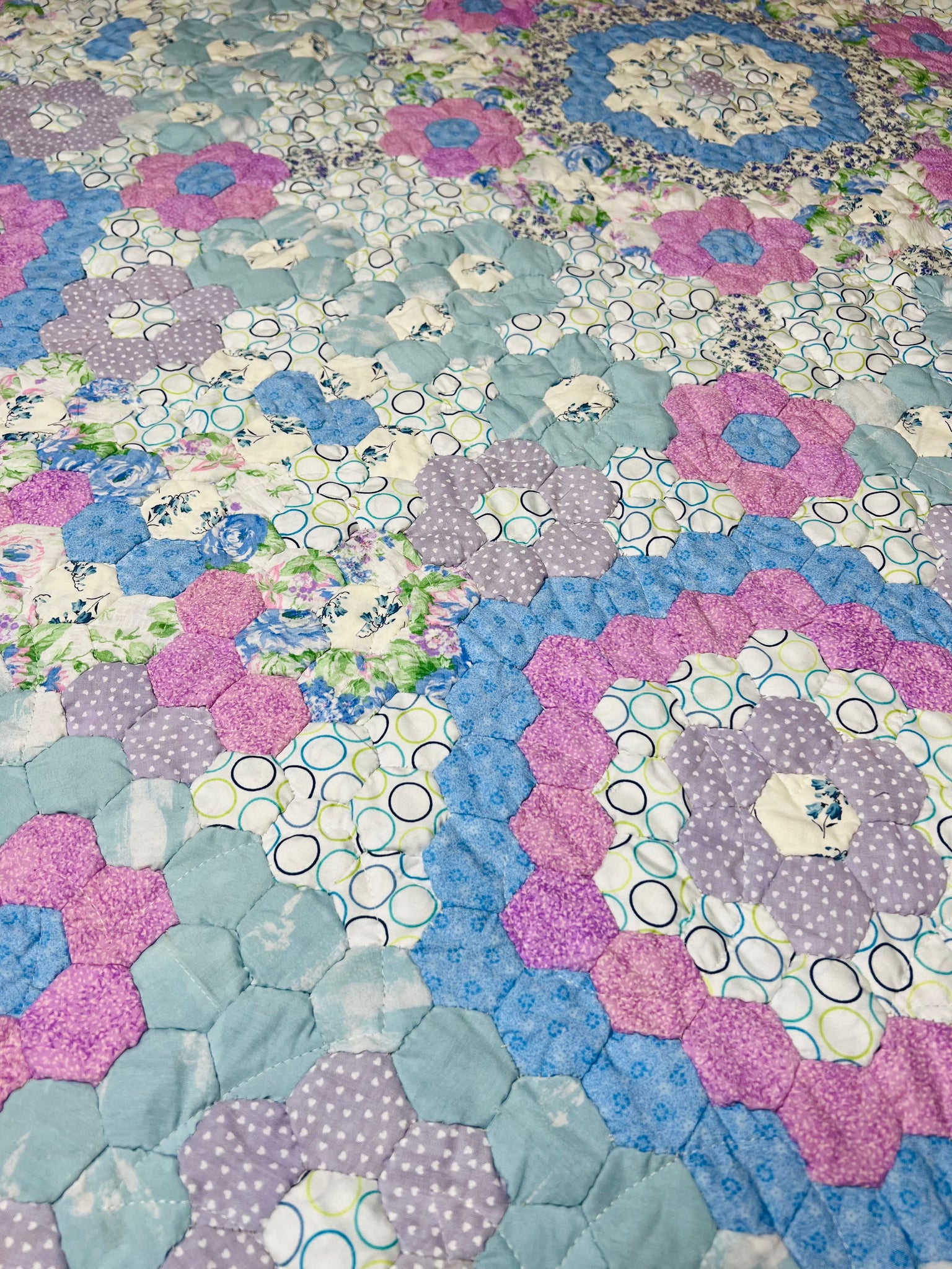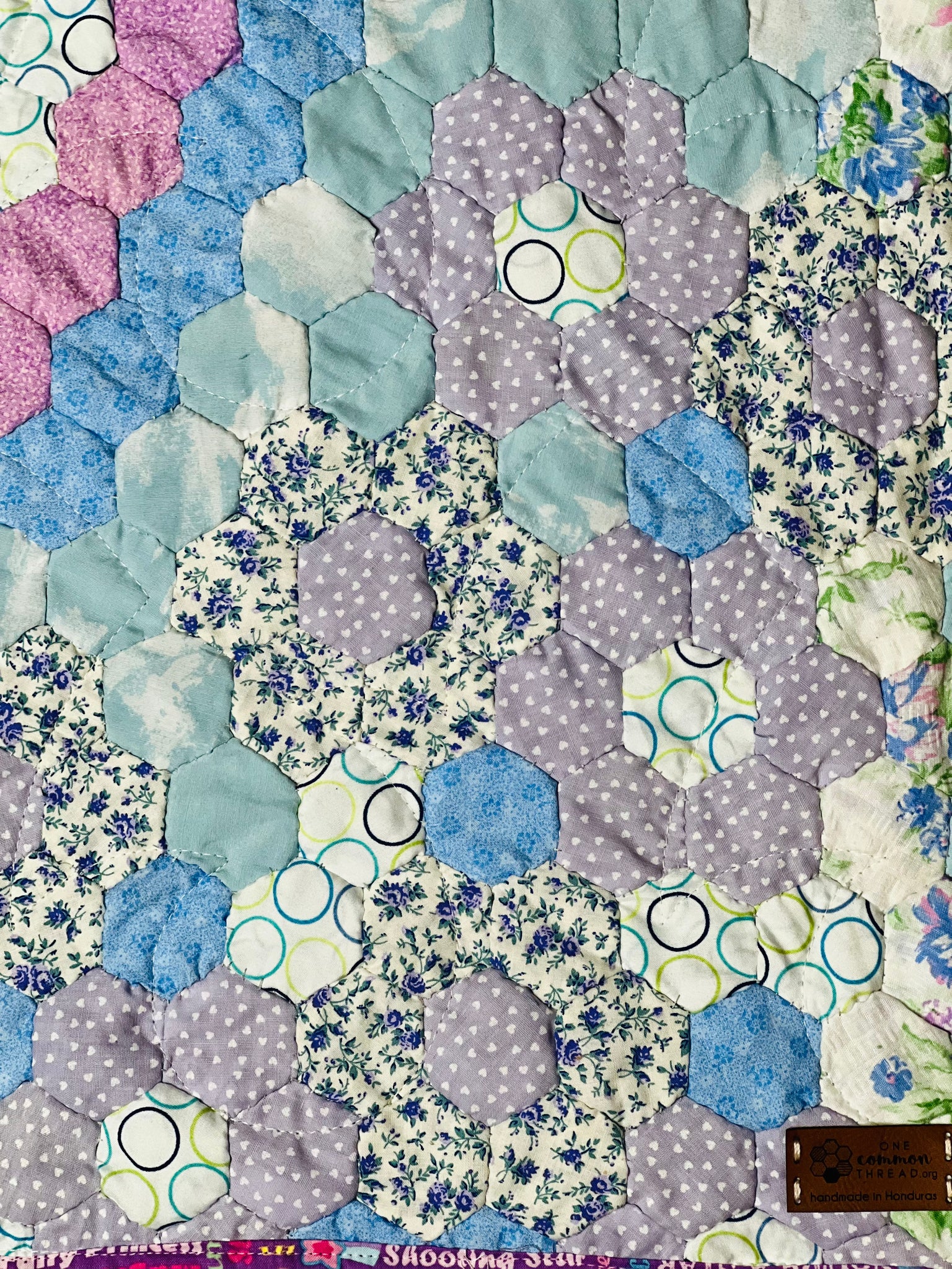 Beautifully hand-stitched hexagon quilt. Majority of fabric is donated and proceeds employ women living in poverty in the "bordos" of San Pedro Sula, Honduras