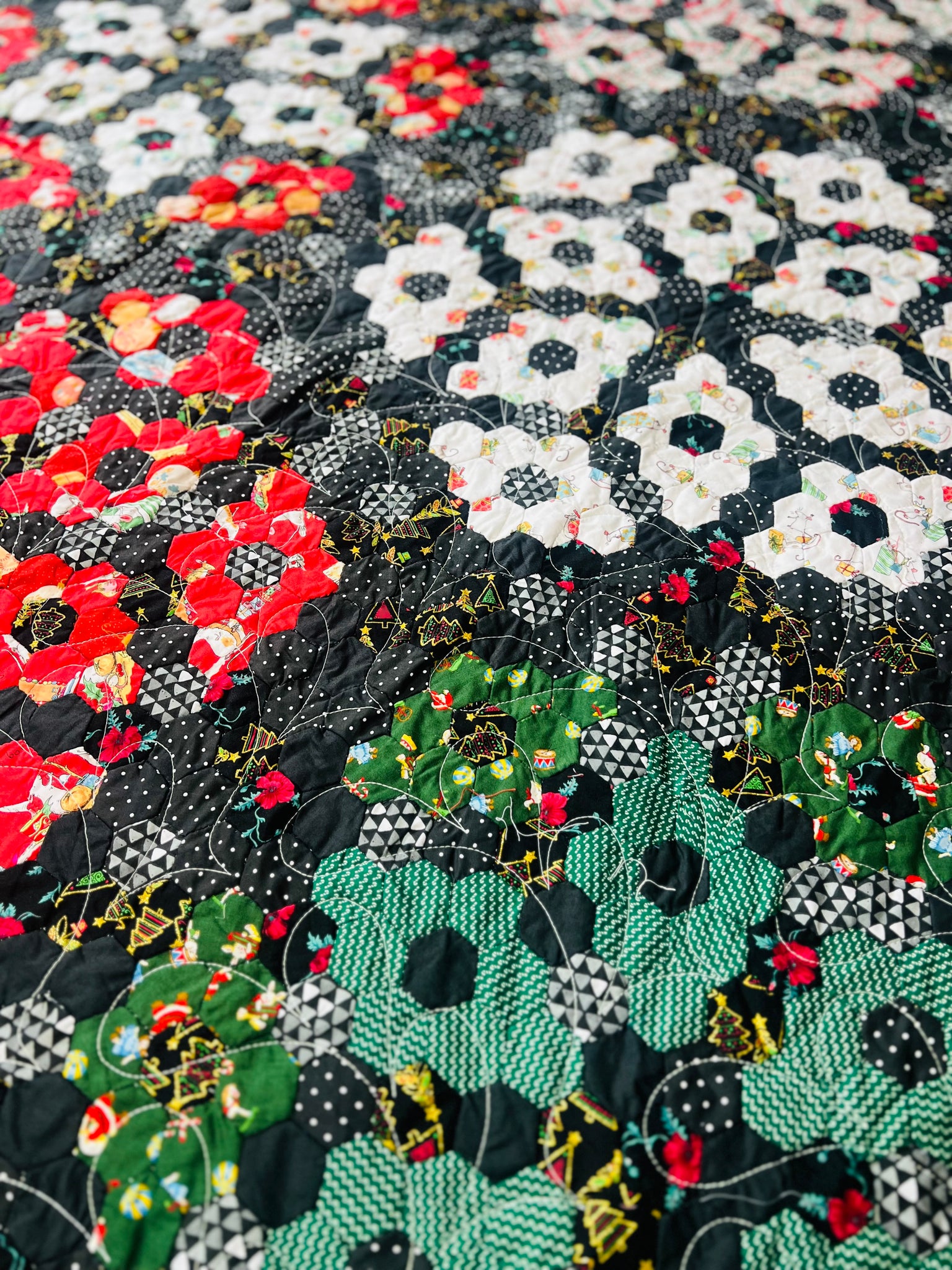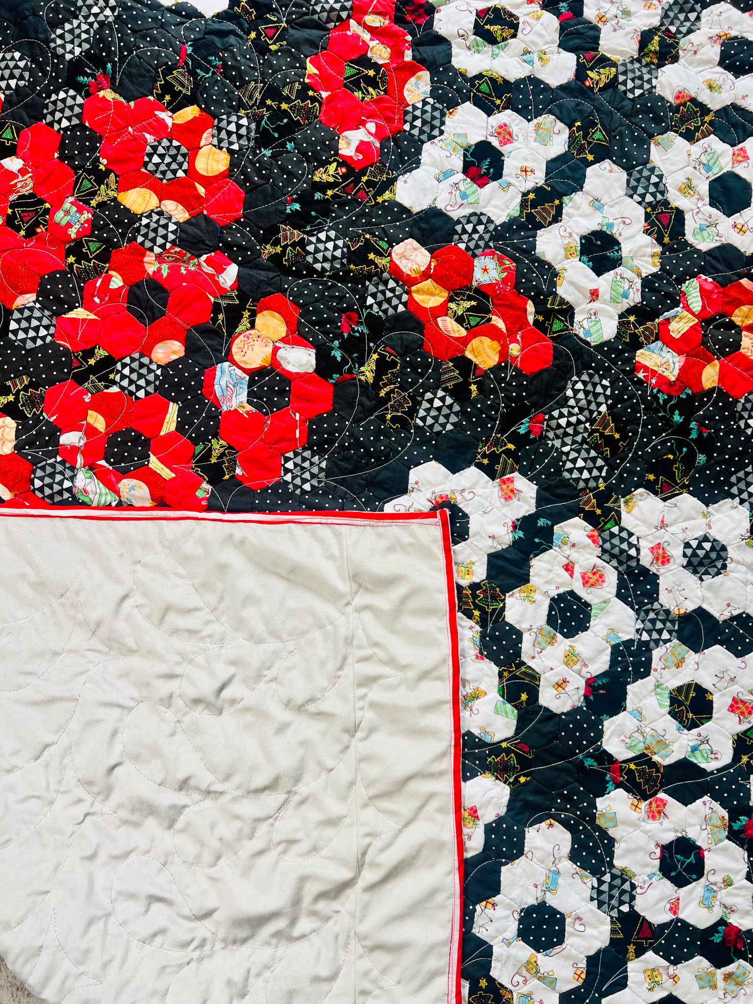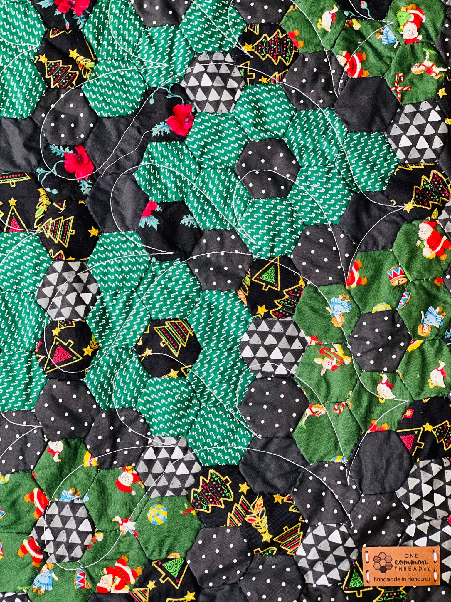 Beautifully hand-stitched hexagon quilt. Majority of fabric is donated and proceeds employ women living in poverty in the "bordos" of San Pedro Sula, Honduras