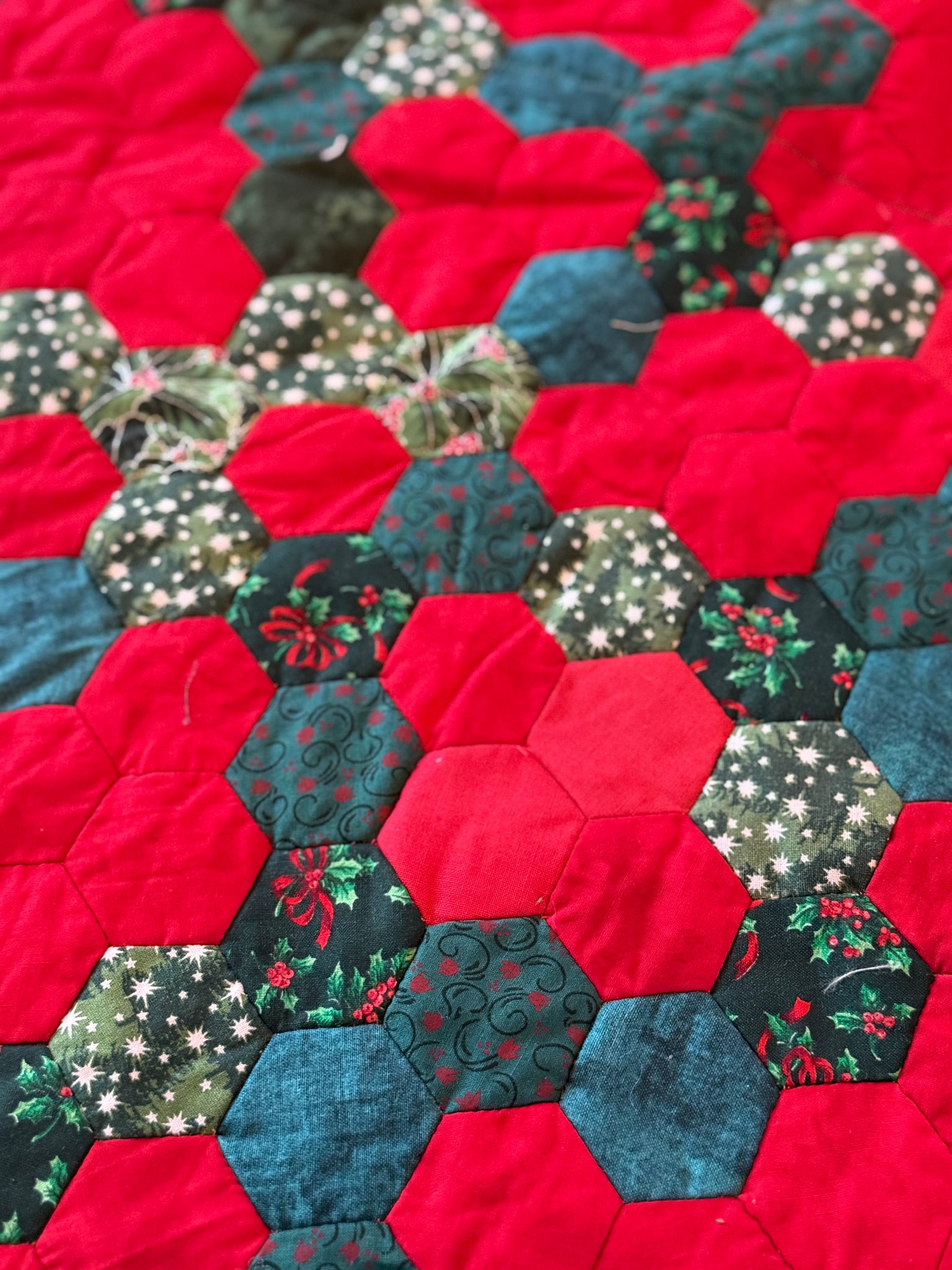 *Each hexagon is made from scrap material, but contains certain predominant colors. Majority of fabric is 100% cotton.