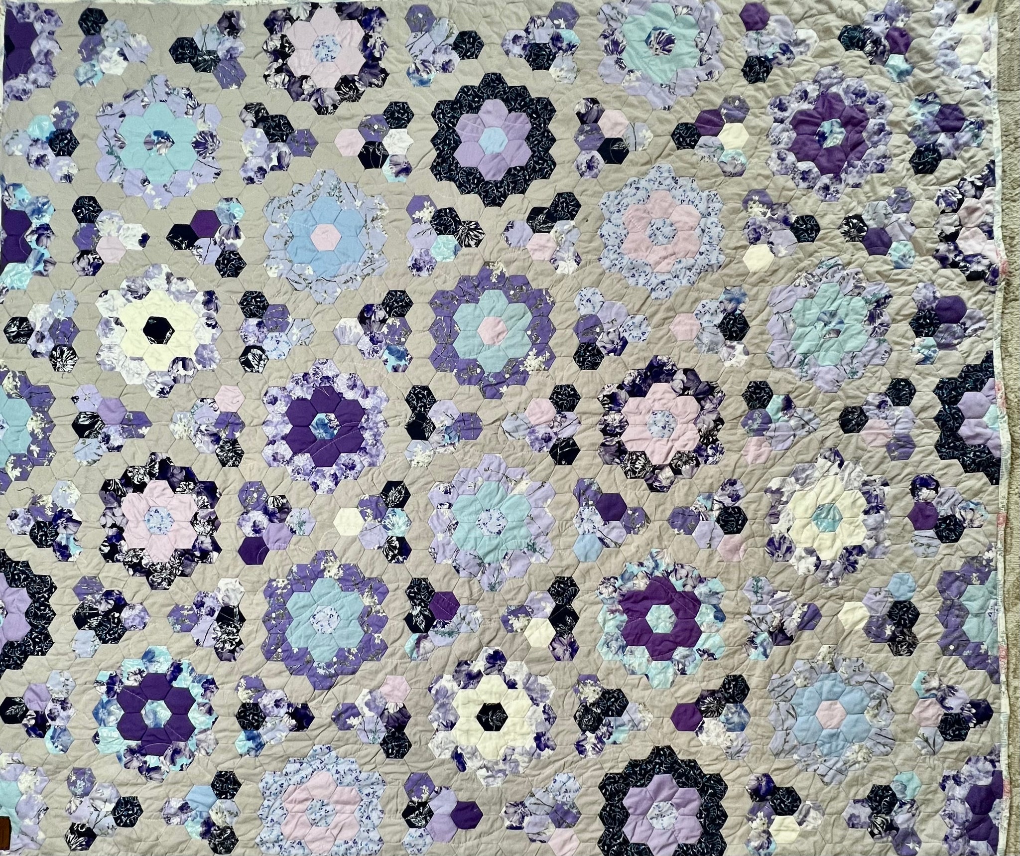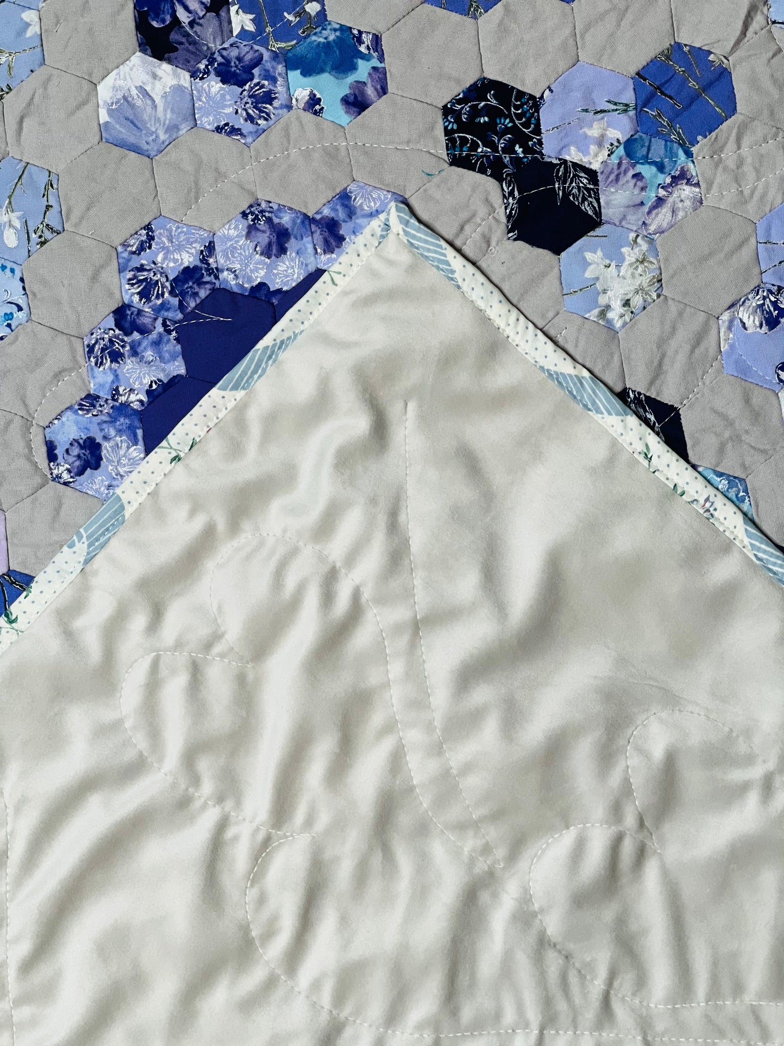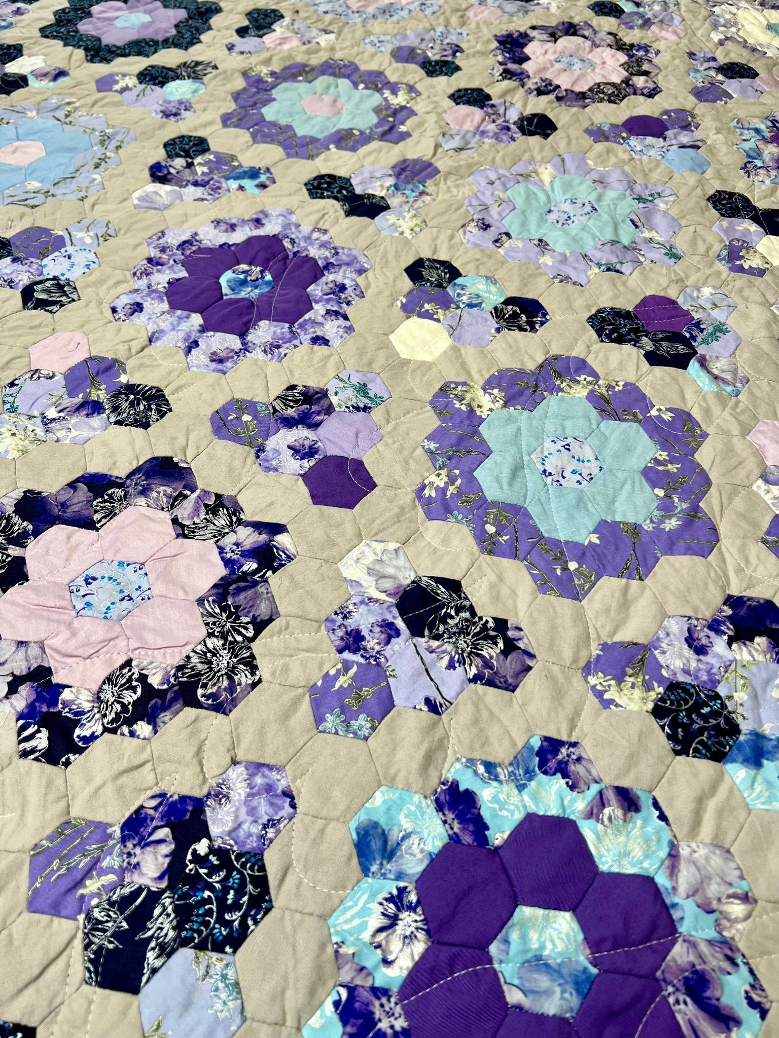 Beautifully hand-stitched hexagon quilt. Majority of fabric is donated and proceeds employ women living in poverty in the "bordos" of San Pedro Sula, Honduras