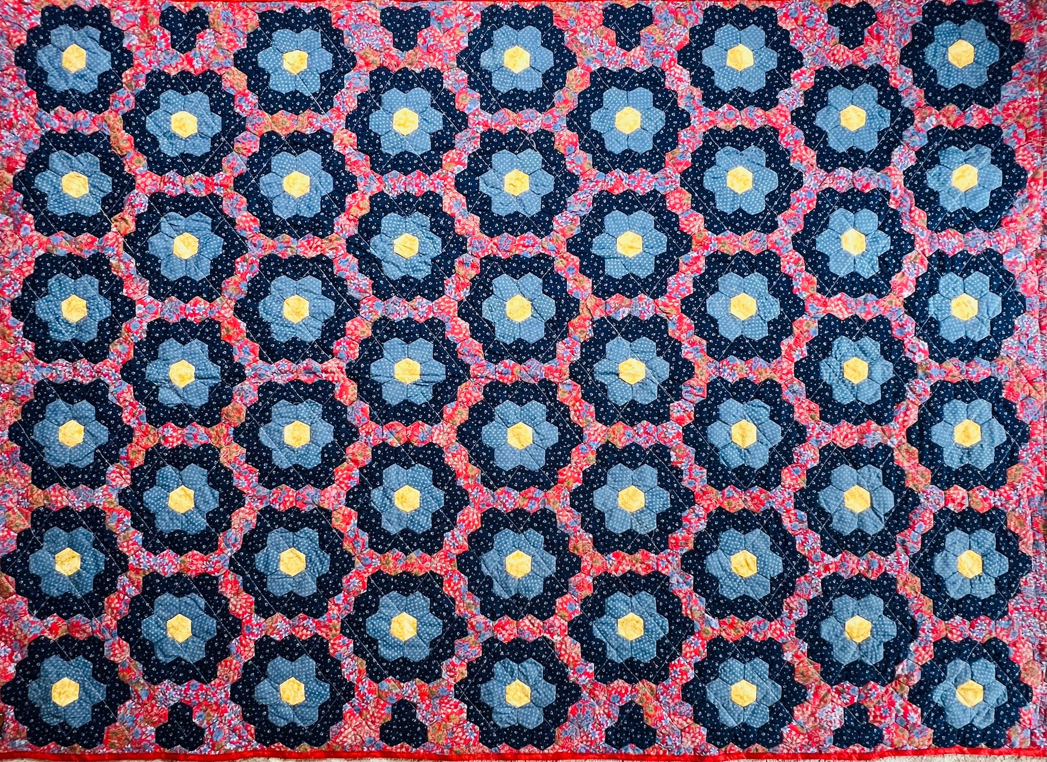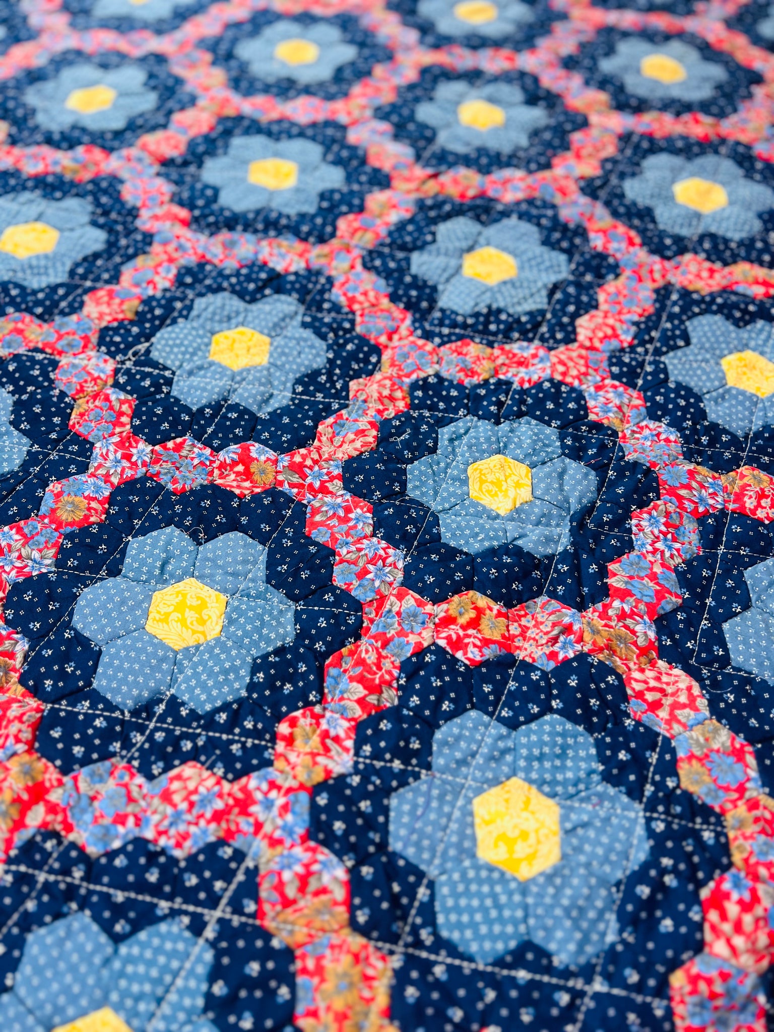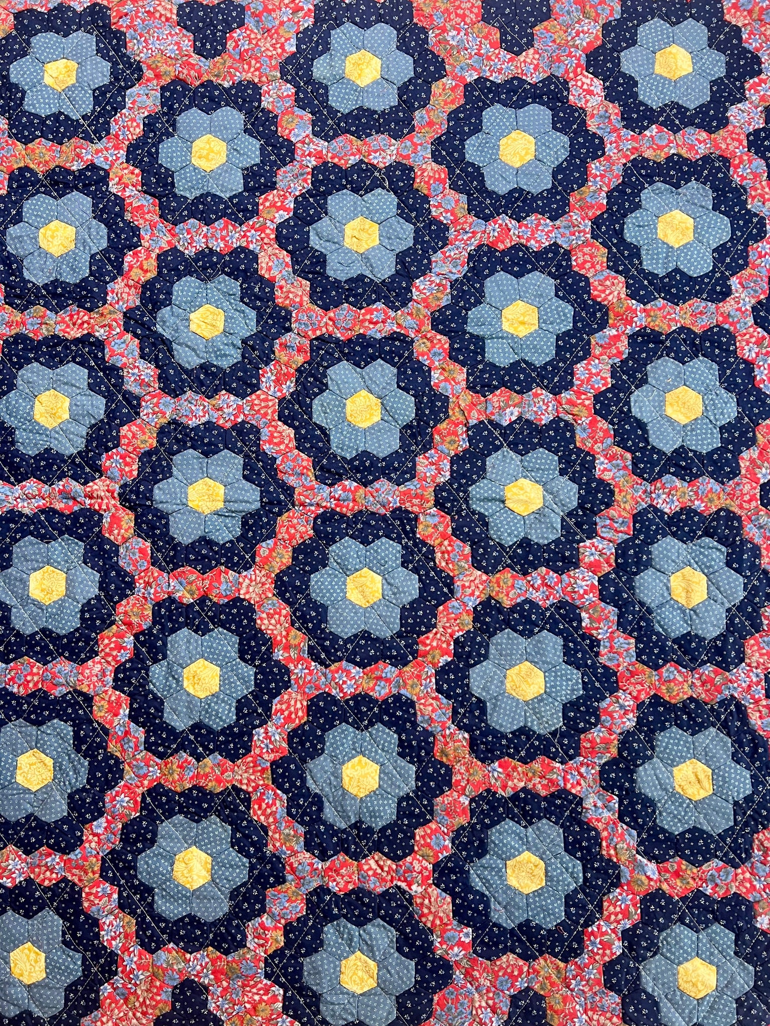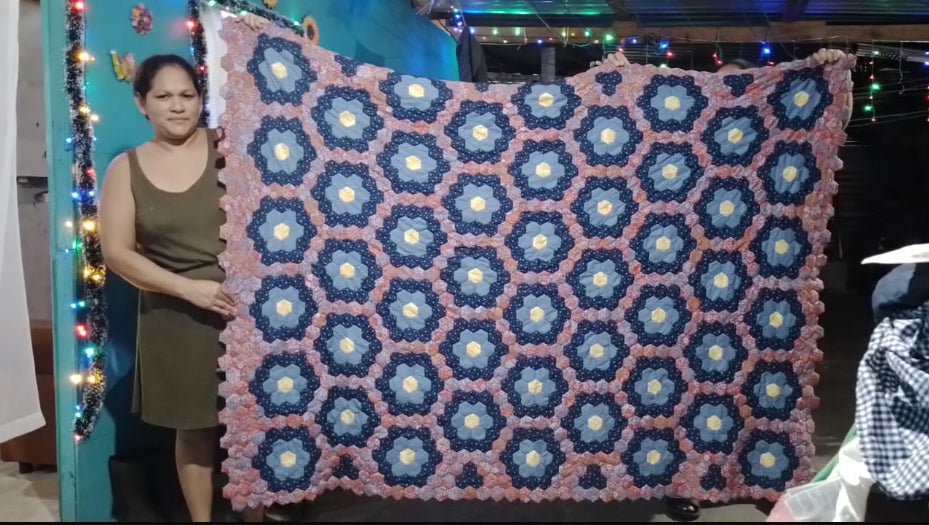 Beautifully hand-stitched hexagon quilt. Majority of fabric is donated and proceeds employ women living in poverty in the "bordos" of San Pedro Sula, Honduras