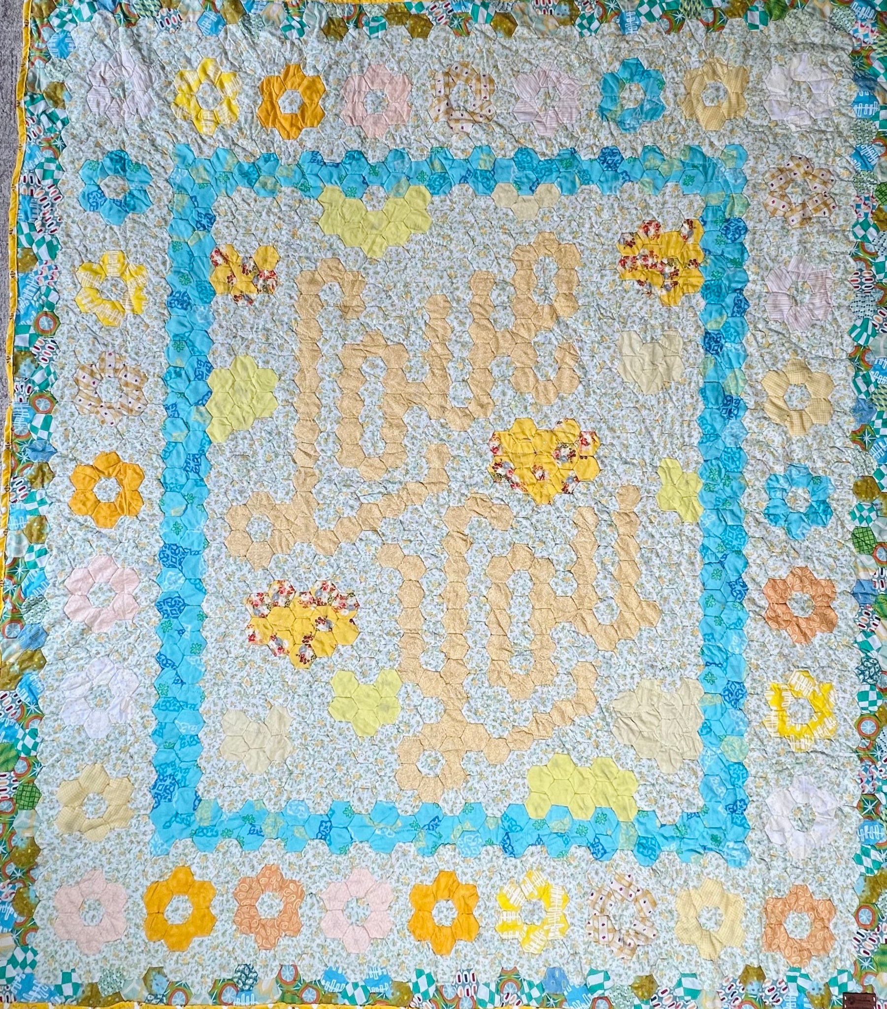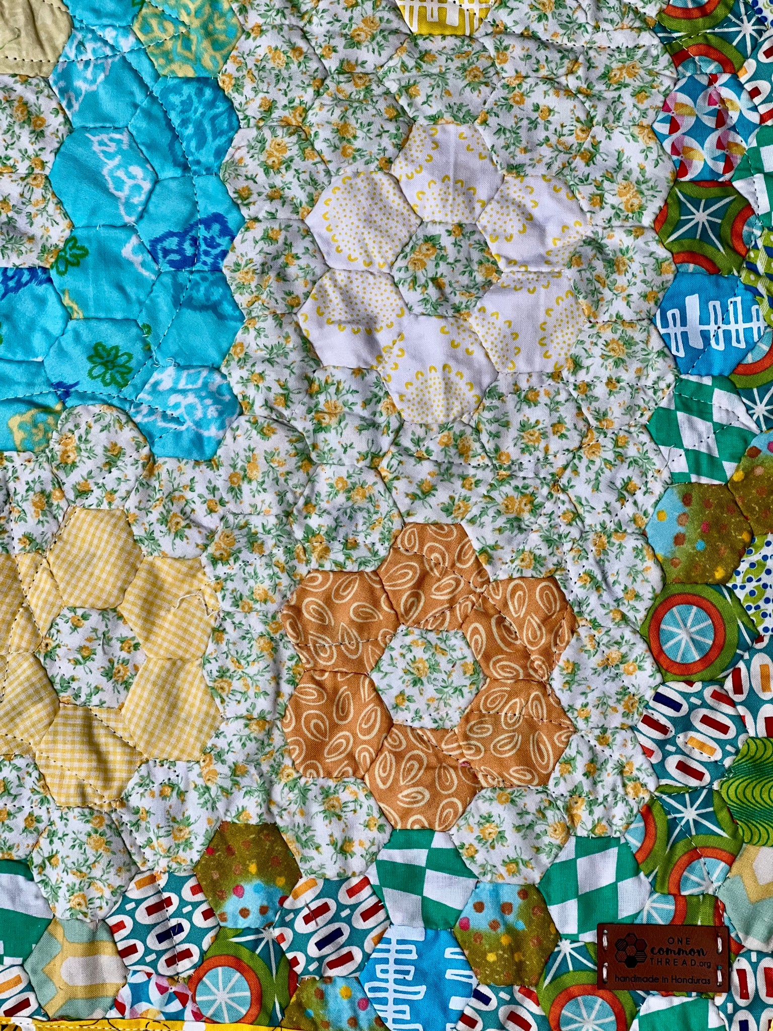 Beautifully hand-stitched hexagon quilt. Majority of fabric is donated and proceeds employ women living in poverty in the "bordos" of San Pedro Sula, Honduras