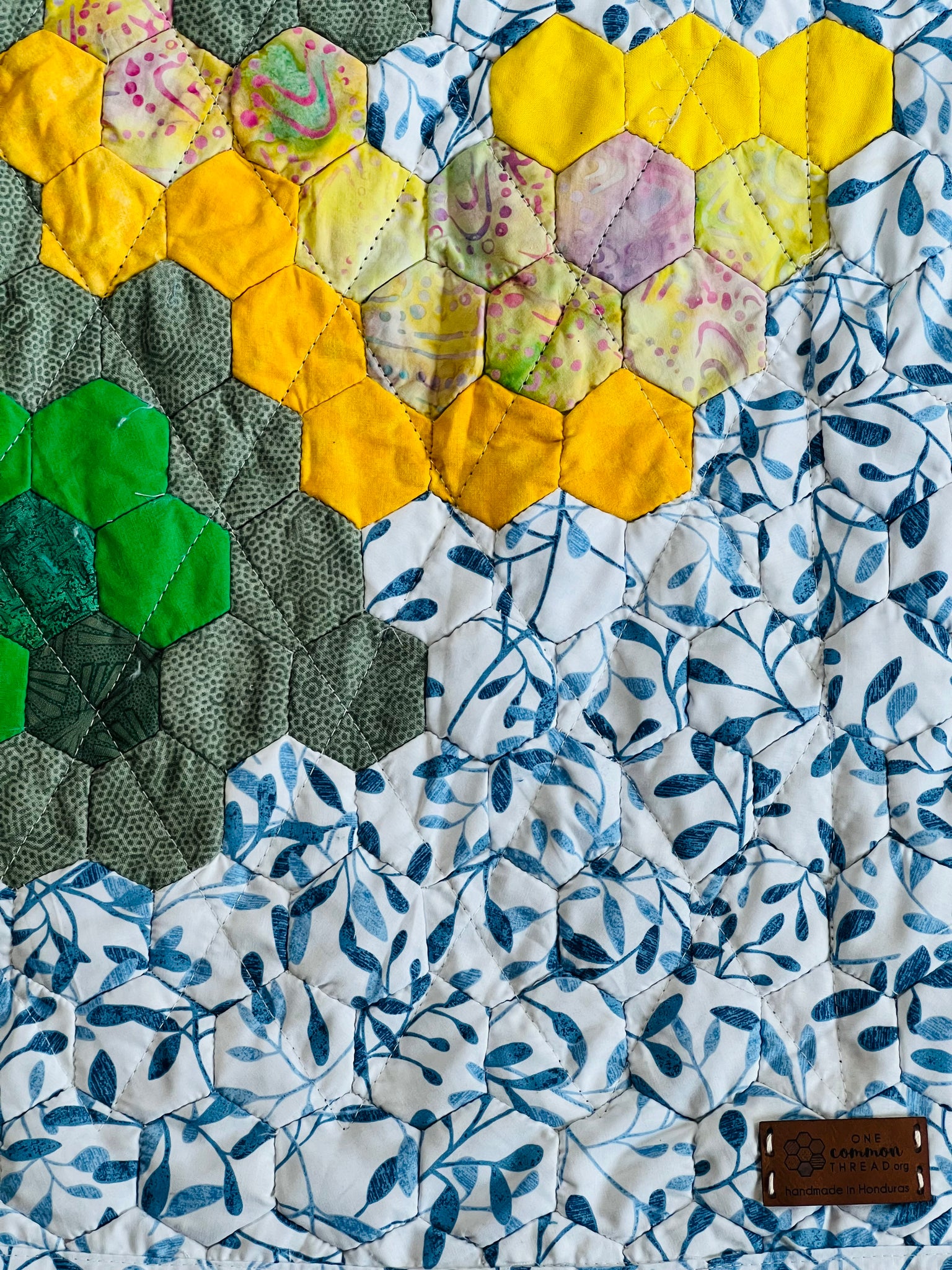 Beautifully hand-stitched hexagon quilt. Majority of fabric is donated and proceeds employ women living in poverty in the "bordos" of San Pedro Sula, Honduras