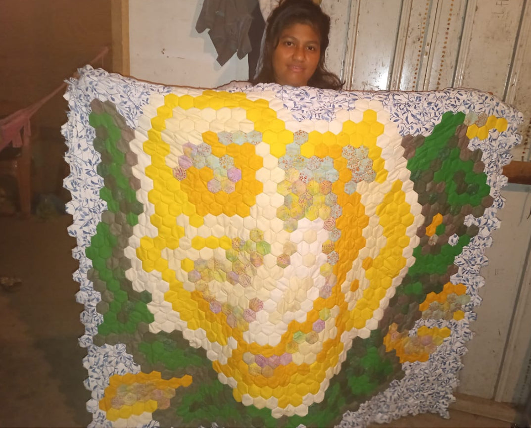 This quilt is a gorgeous yellow rose quilt that is super hard to make. This quilt is called Yellow Rose of Texas and is made by one of our original Makers named Nancy. Nancy, is the 21-year-old daughter of Delia another one of our original Makers and has her own unique journey and challenges as a young mother. She has a son named Enrique, who was named after his father, and recently welcomed a new baby girl named Courtney. Unfortunately, Enrique's father left the Bordo due to the threats posed by gangs, resulting in limited involvement in his son's life.