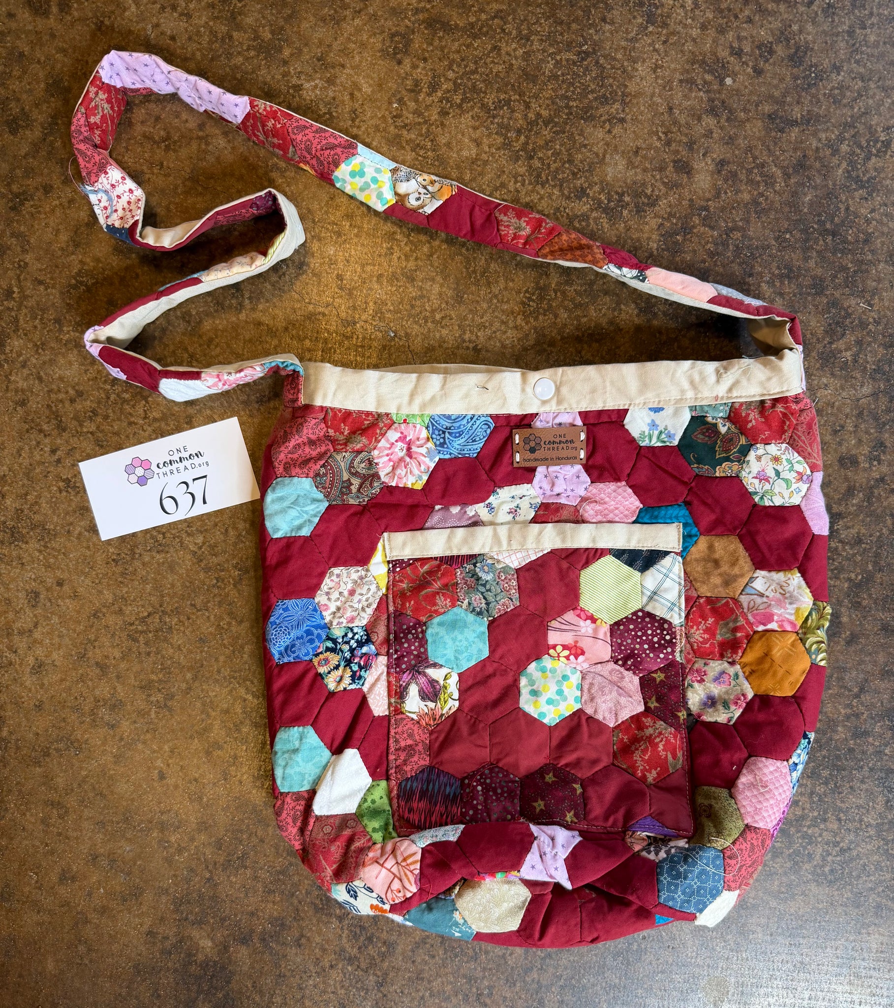 This bag is made in a diamond scrap design in various colors with light brown colored trim. Wide front pocket pocket.