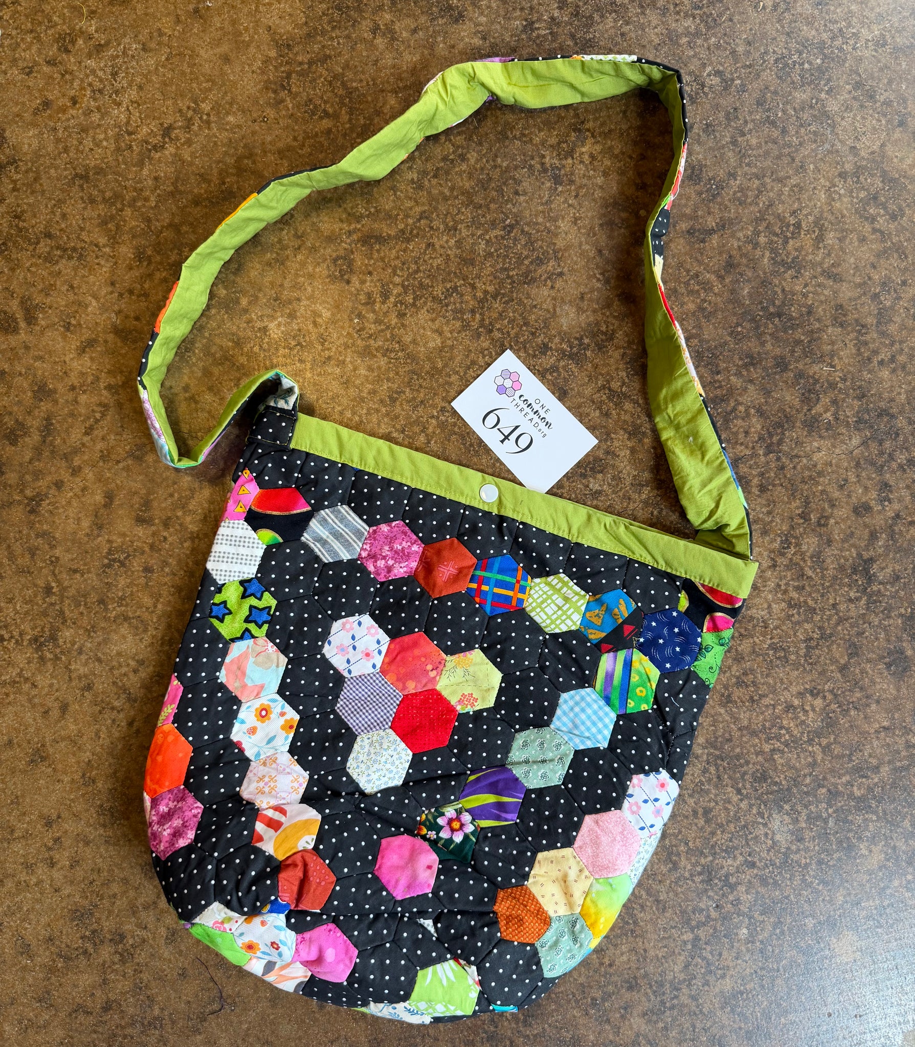 This bag is made in a black triangle and scrap design in various colors with green colored trim. Wide front pocket pocket.