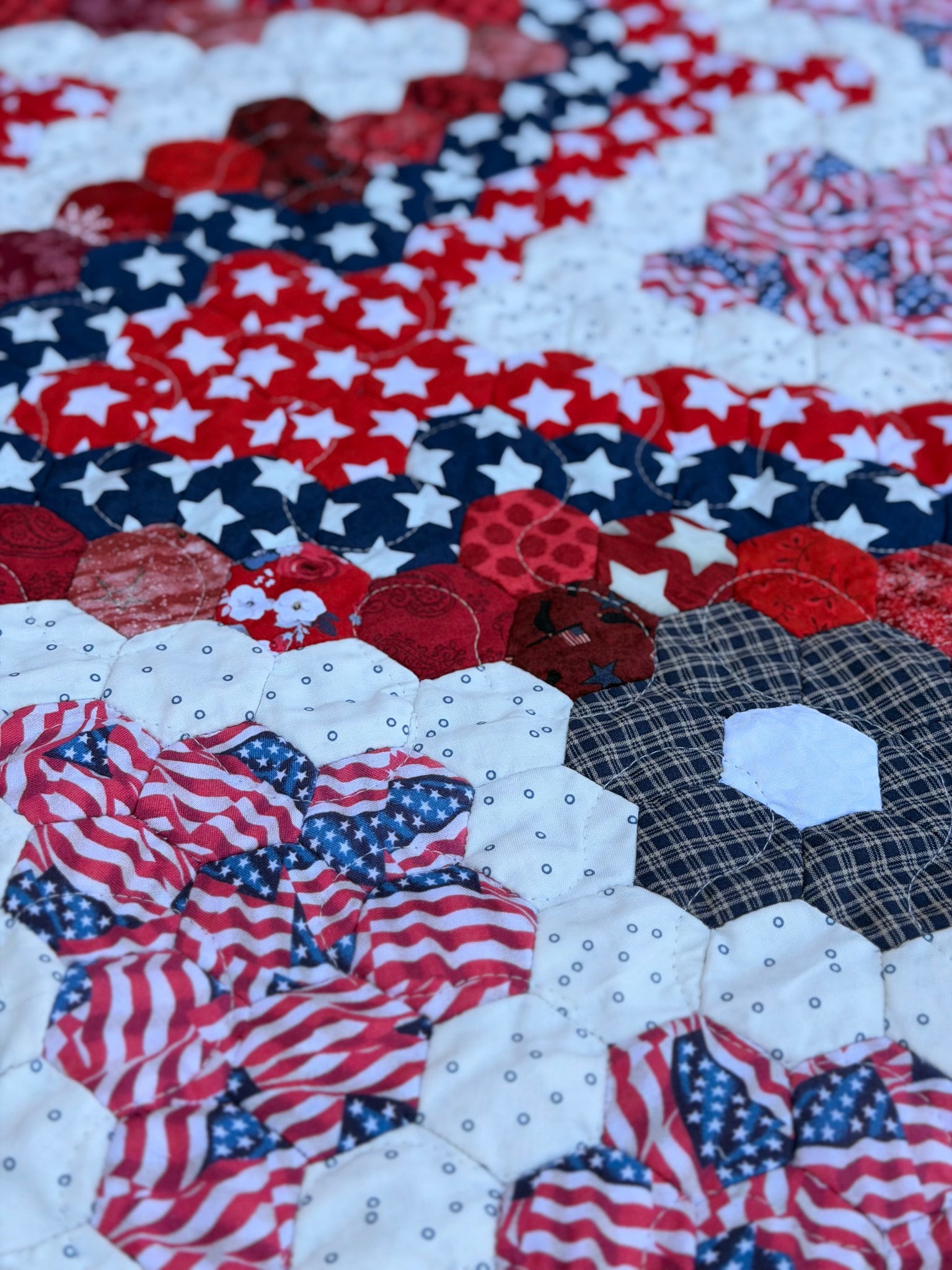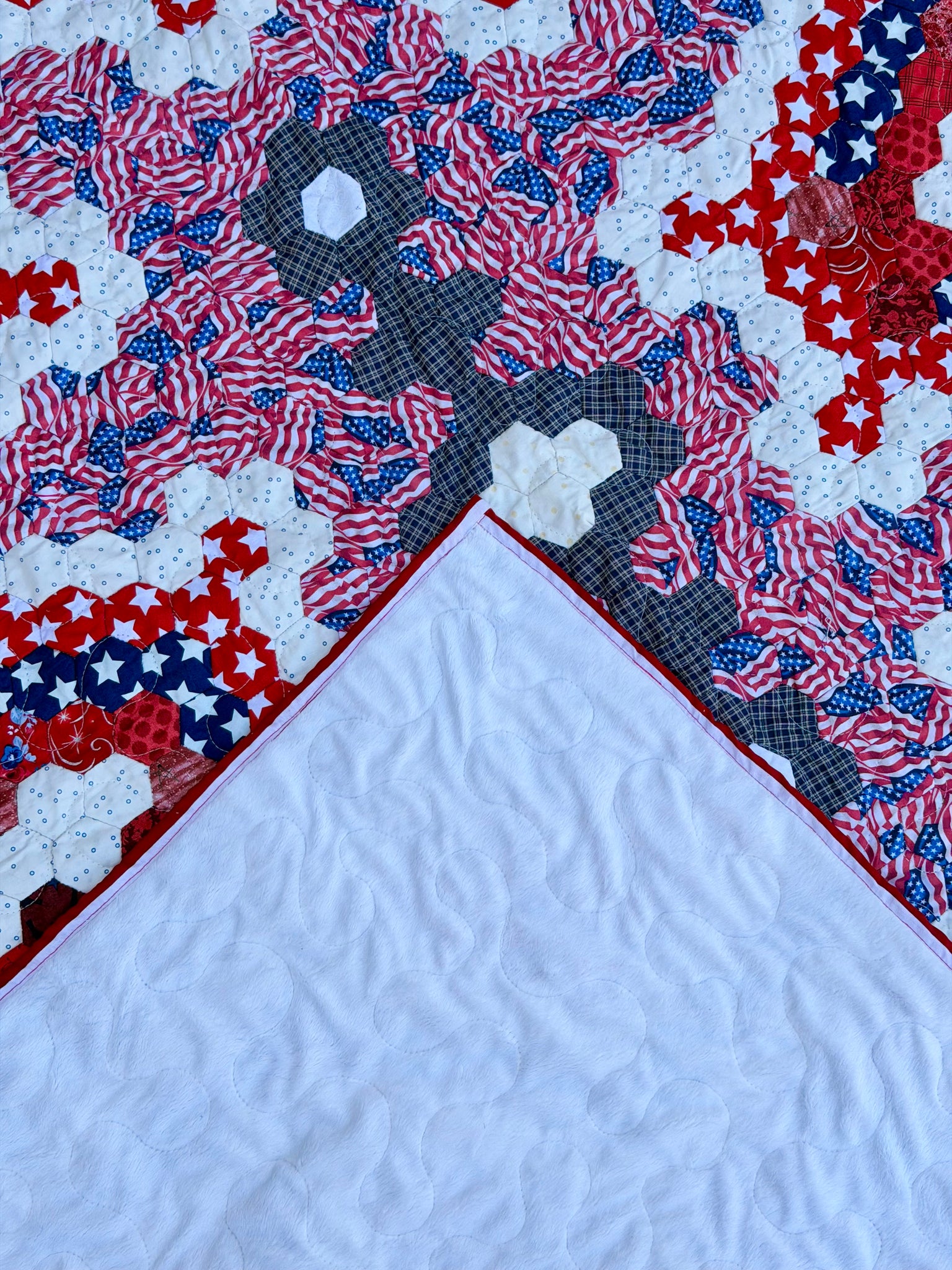 Beautifully hand-stitched hexagon quilt. Majority of fabric is donated and proceeds employ women living in poverty in the "bordos" of San Pedro Sula, Honduras