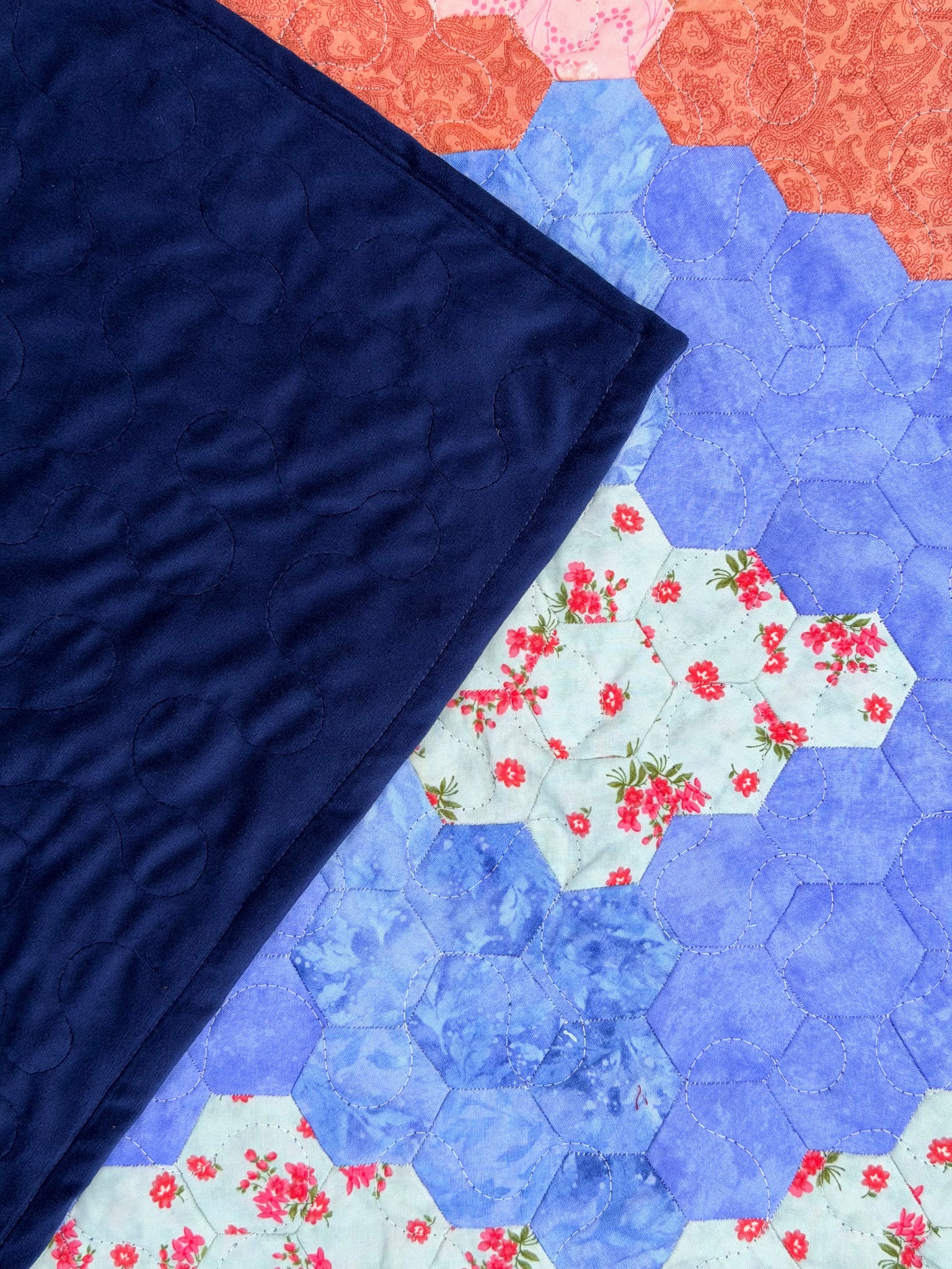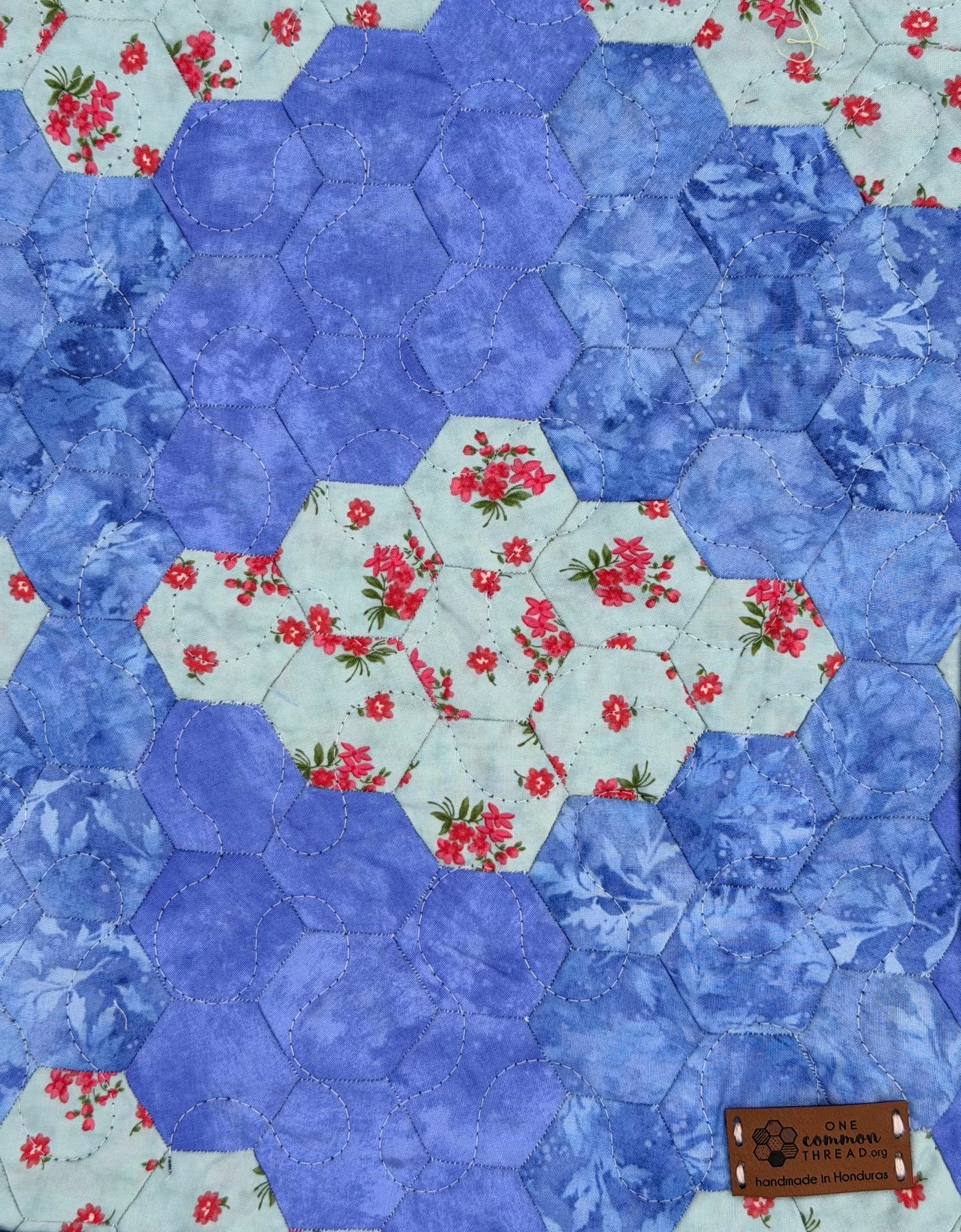 Beautifully hand-stitched hexagon quilt. Majority of fabric is donated and proceeds employ women living in poverty in the "bordos" of San Pedro Sula, Honduras