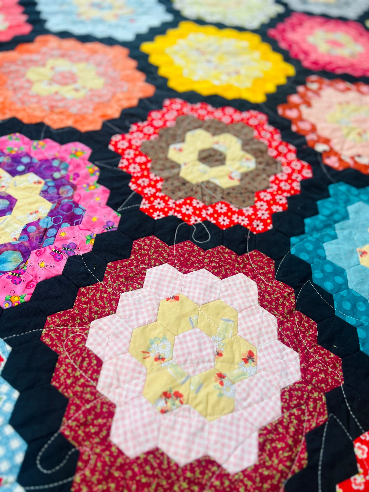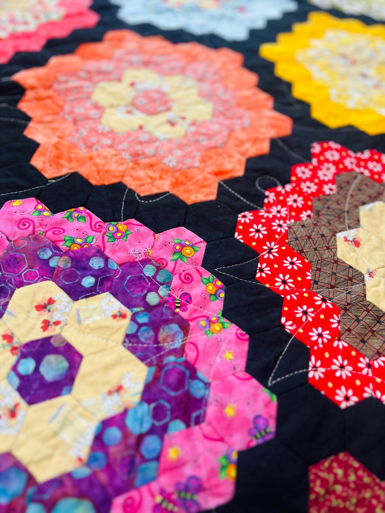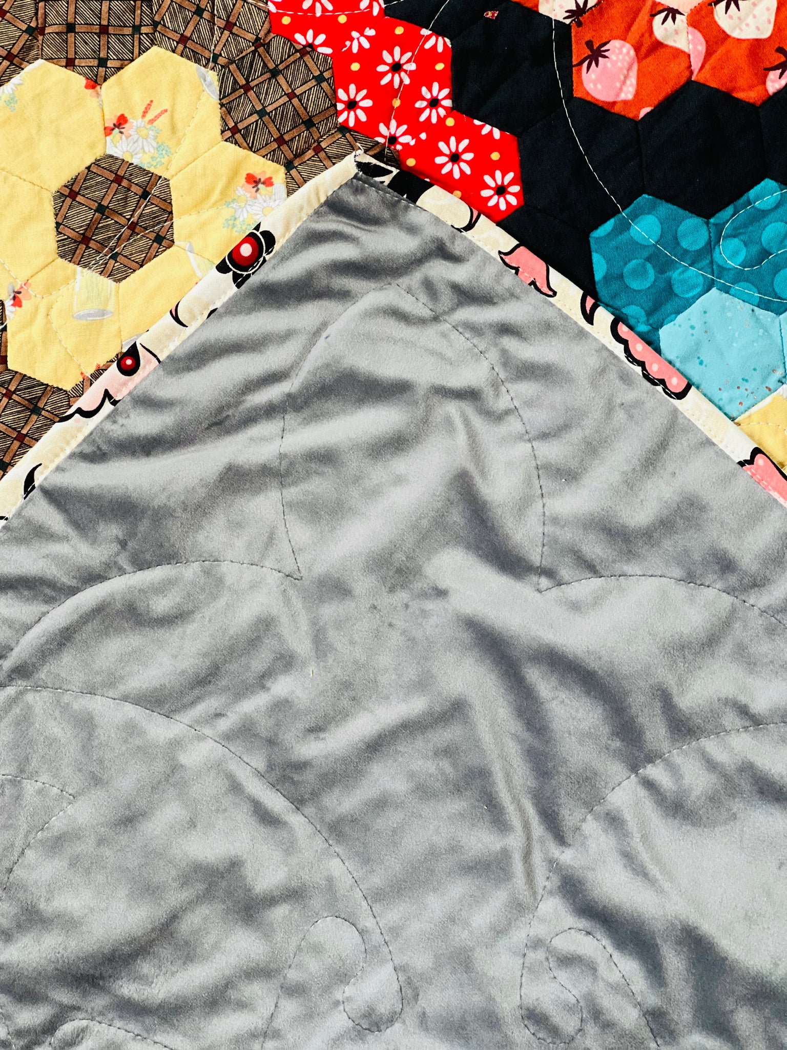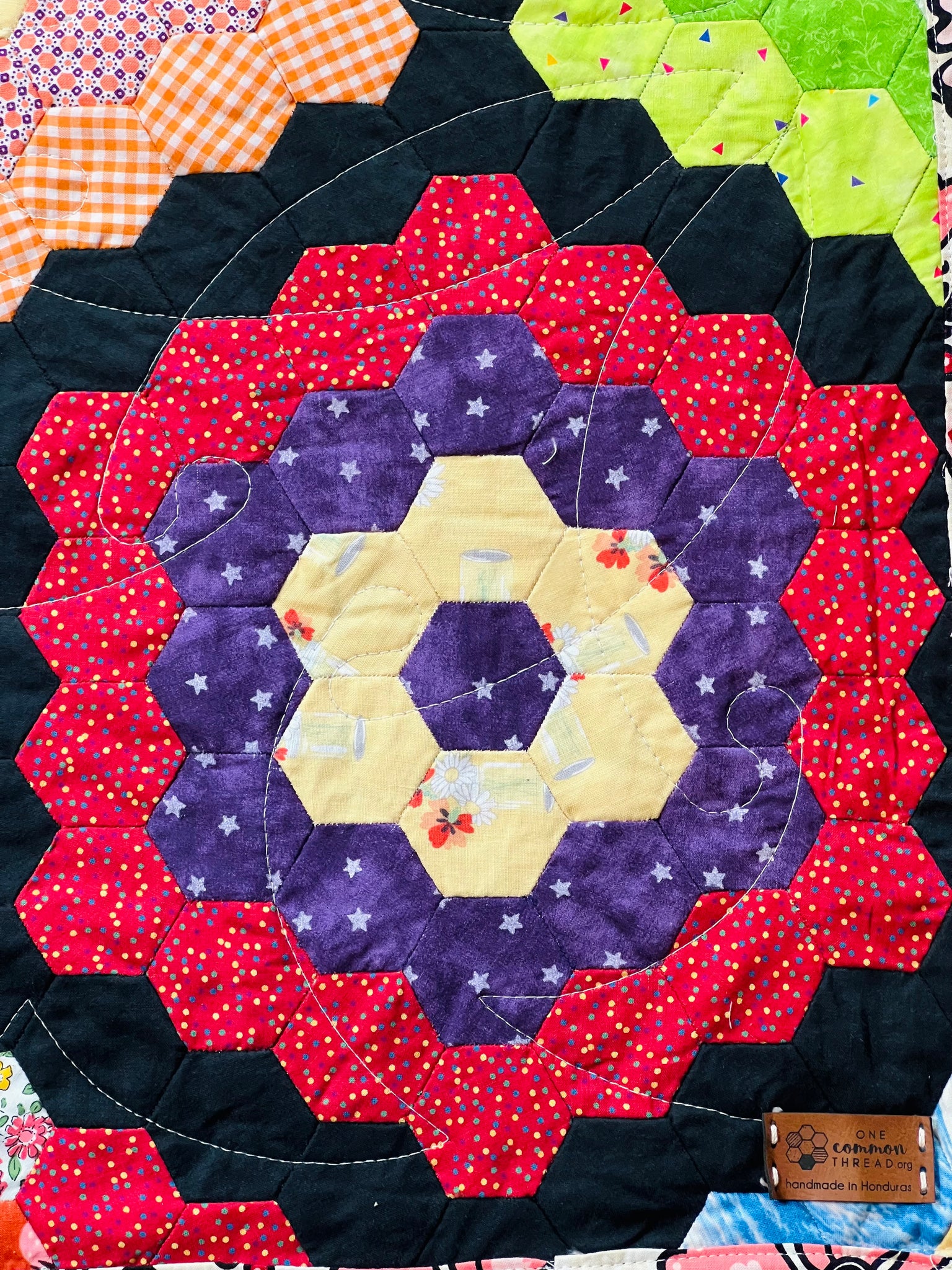Beautifully hand-stitched hexagon quilt. Majority of fabric is donated and proceeds employ women living in poverty in the "bordos" of San Pedro Sula, Honduras