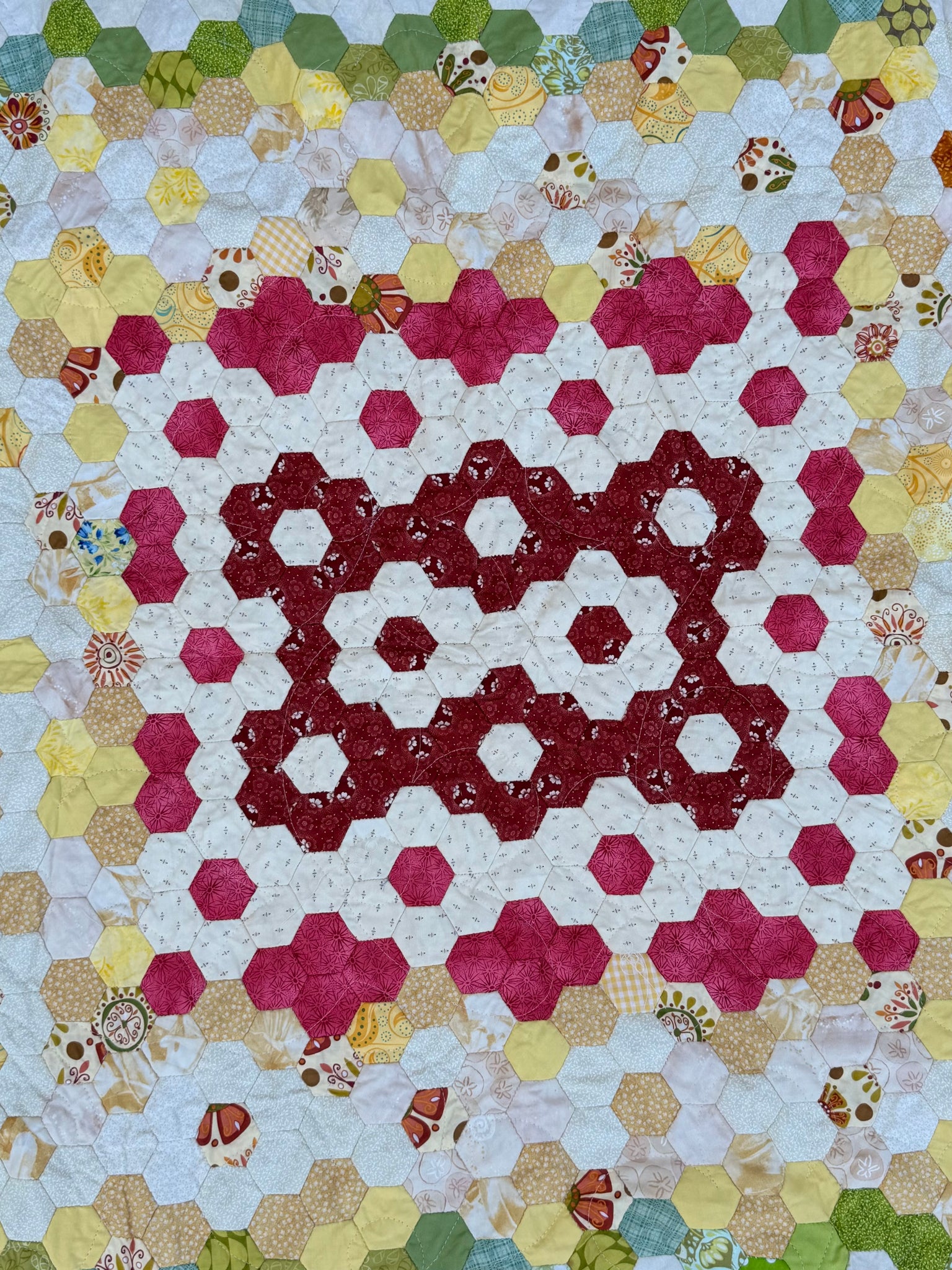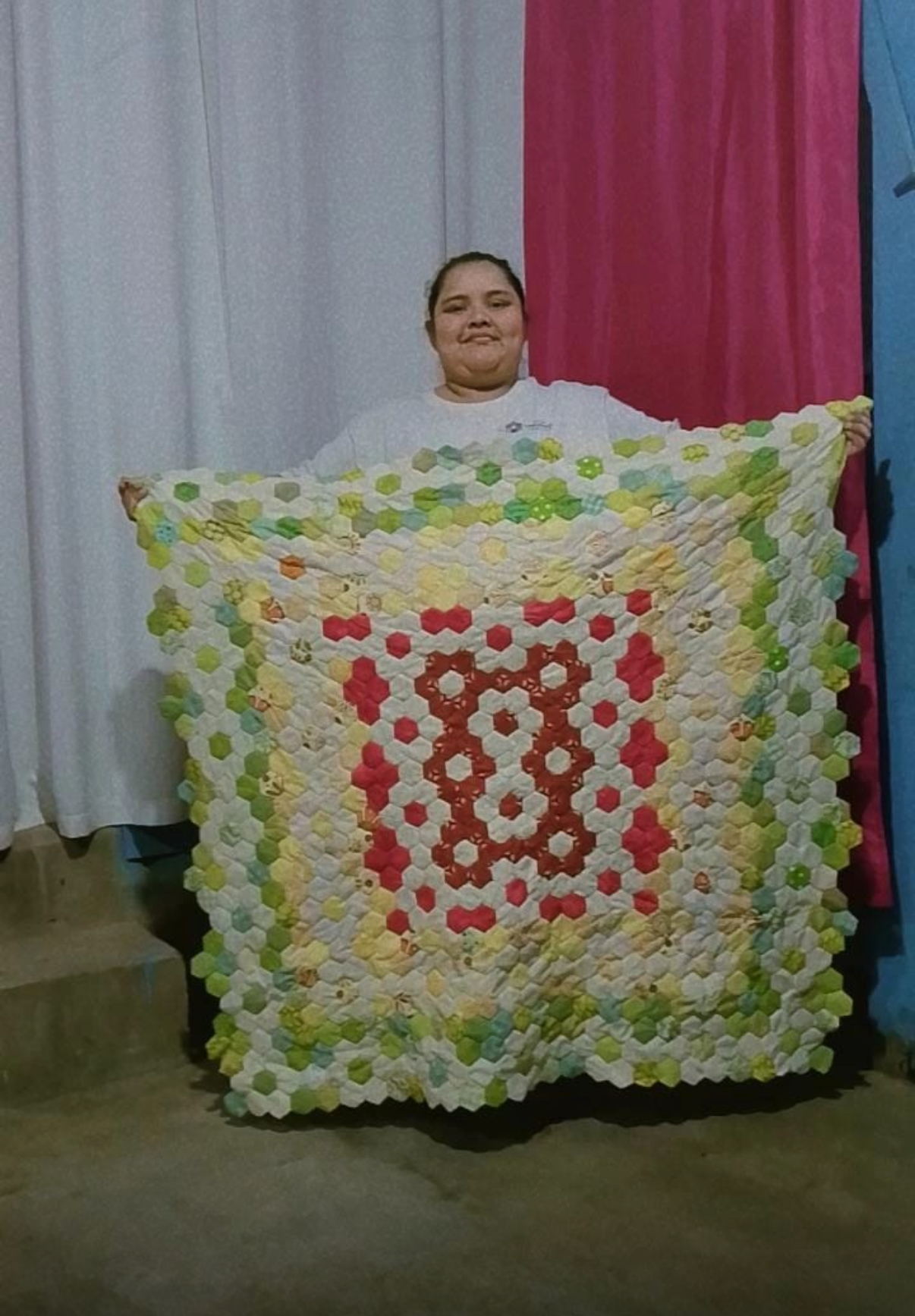 Beautifully hand-stitched hexagon quilt. Majority of fabric is donated and proceeds employ women living in poverty in the "bordos" of San Pedro Sula, Honduras