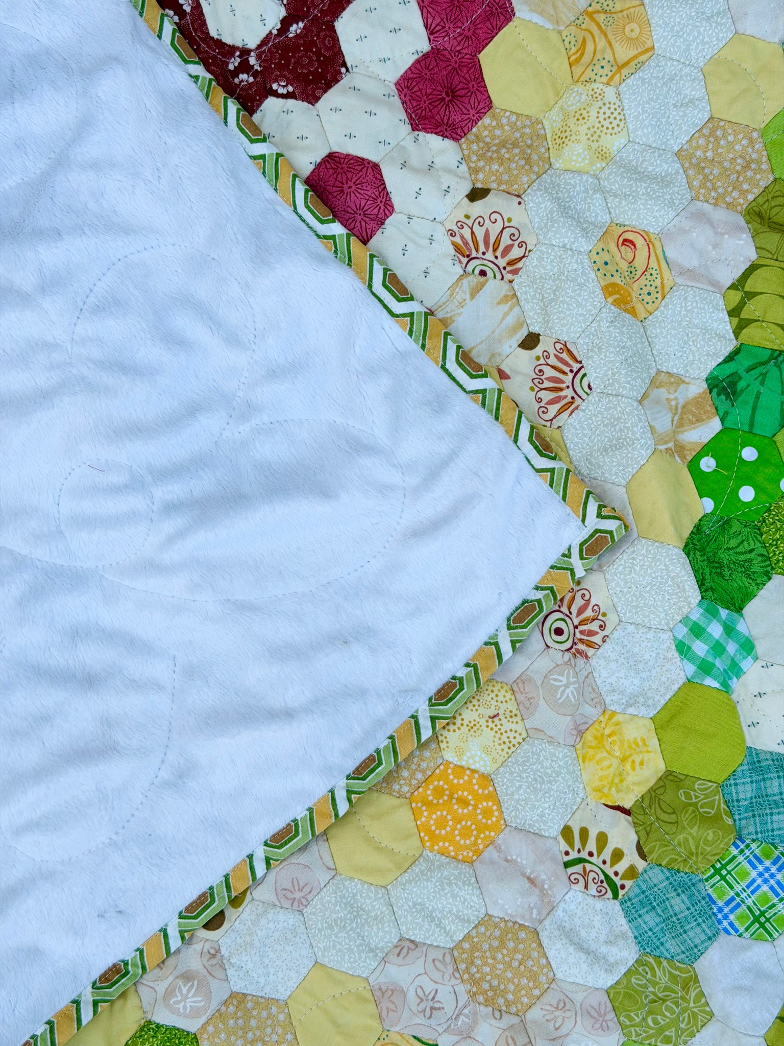 This scrappy 1" hexagon quilt was made by Kendy. It is a very beautiful flower quilt and has a super soft white minky backing.